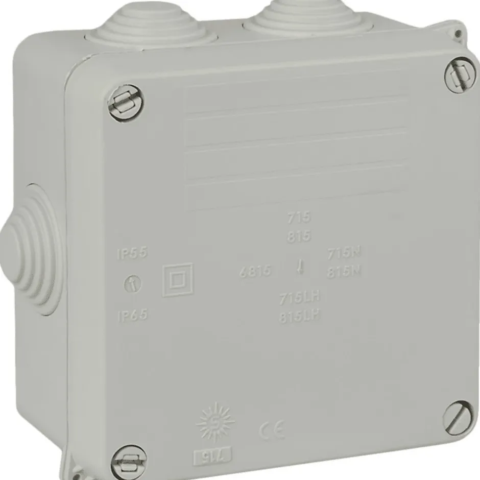 Boîte étanche de connexion : 100 x 100 x 55 mm. Couleur gris RAL 7035. Protection : IP55, IK07, IK08. Fermeture à vis 1/4 de tour. Scellable. Mode d’installation : en saillie. Avec 7 cônes pour tube de Ø 25 mm. Forme carrée. Garantie 2 ans.