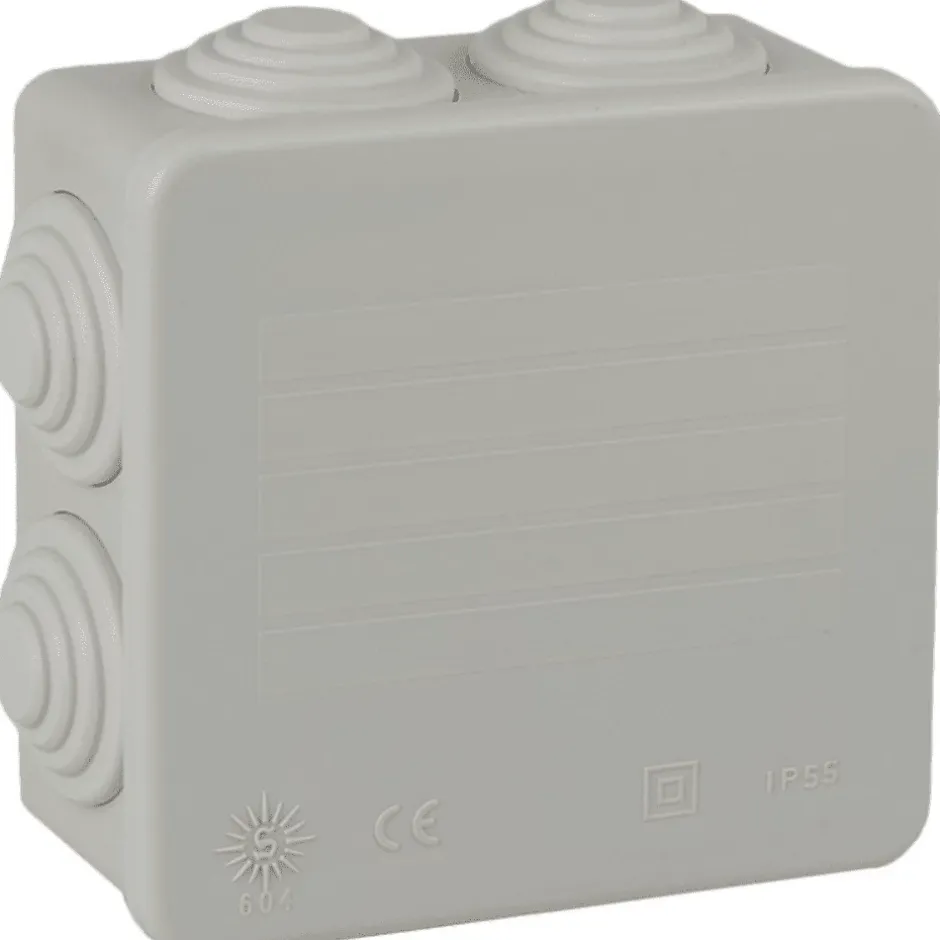 Boîte étanche de connexion : 80 x 80 x 35 mm. Couleur gris RAL 7035. Protection : IP55, IK07. Fermeture du couvercle à pression. Mode d’installation : en saillie. Nombre d’entrées : 8. Forme carrée. Garantie 2 ans.