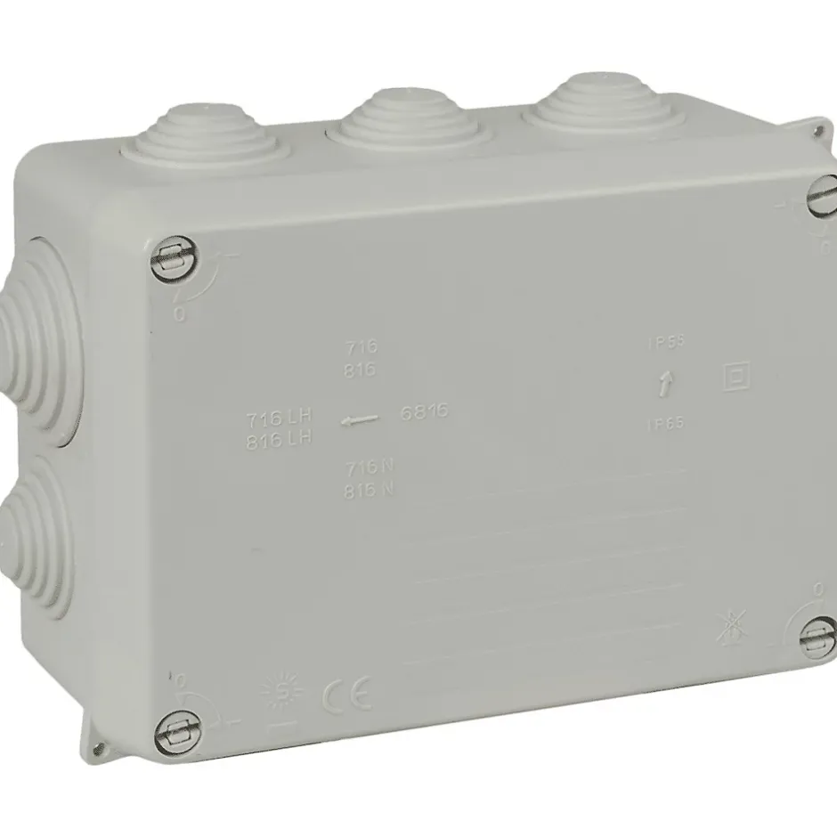 Boîte étanche de connexion : 153 x 110 x 65 mm. Couleur gris RAL 7035. Protection : IP55, IK08. Fermeture à vis 1/4 de tour. Scellable. Mode d’installation : en saillie. Nombre d’entrées : 10 (8 en Ø 25 mm et 2 en Ø 32 mm). Forme rectangulaire. Garantie 2 ans.