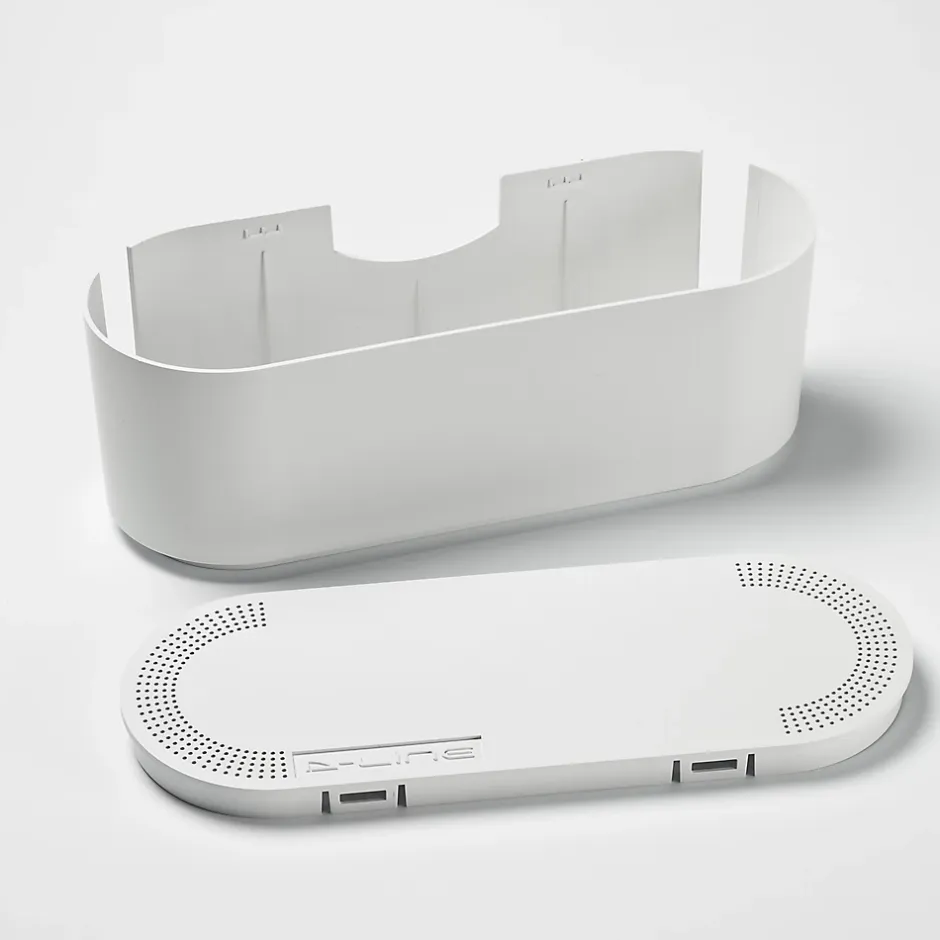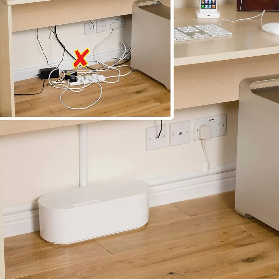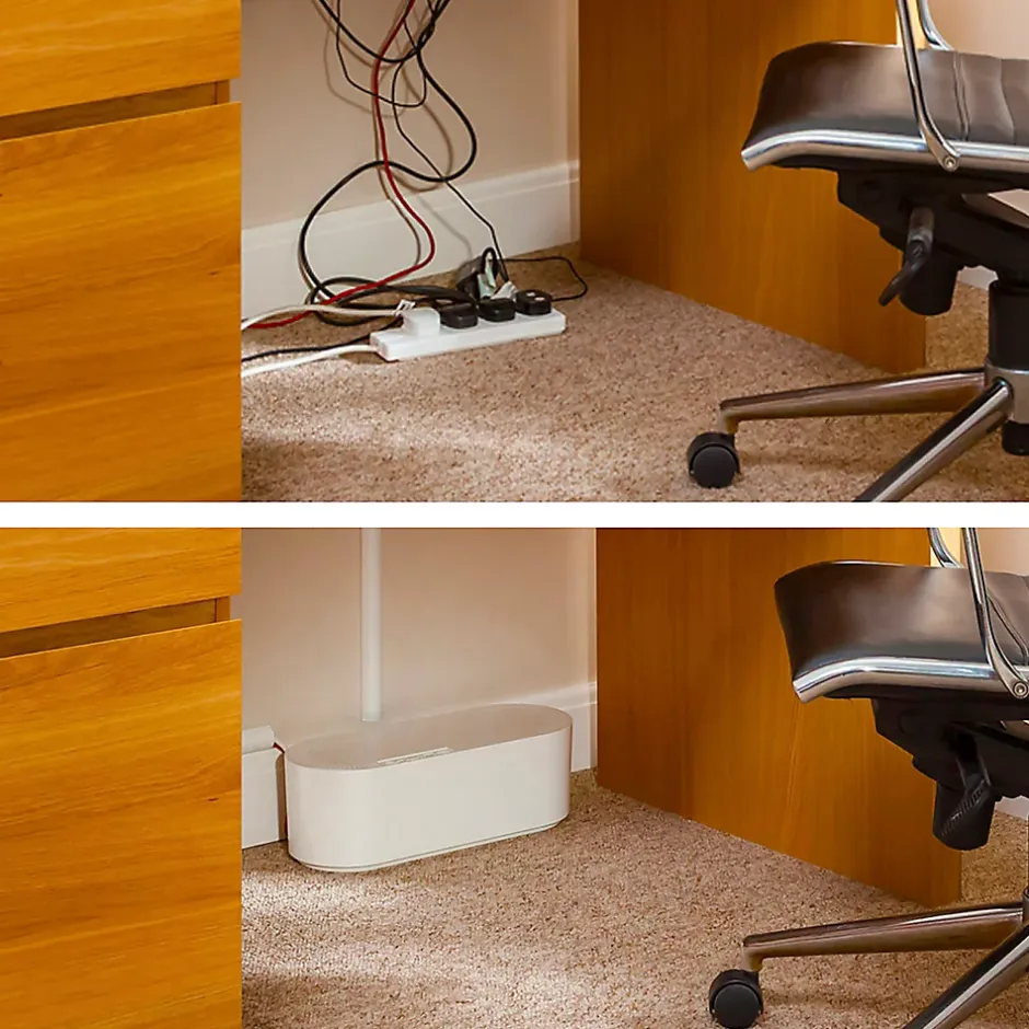 Cet organisateur de câbles blanc L. 325 x l. 125 mm permet de cacher les multiprises et leurs câbles.
