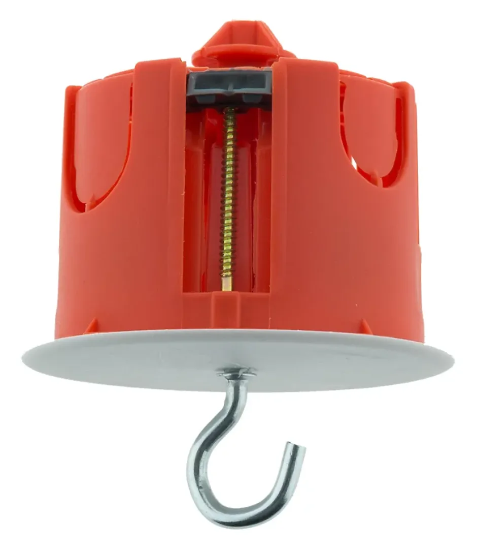 Boîte point de centre murs creux placo. Pour installation luminaire au plafond. Livrée avec crochet. Charge maximale supportée 25kg. Haute résistance au feu 850°. Dimensions extérieures Ø65mm et profondeur 50mm. Diamètre de perçage Ø67mm