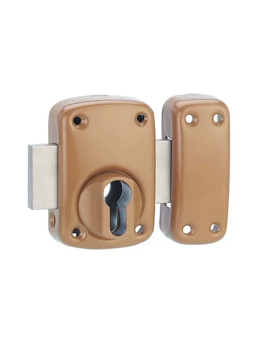 Boitier de verrou pour cylindre profilé. Livré sans cylindre. Coffre et gâche acier embouti. Pêne acier chromé mat. Pour porte d’entrée. Finition epoxy or.