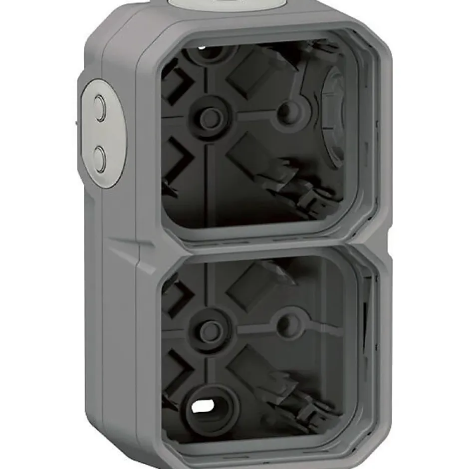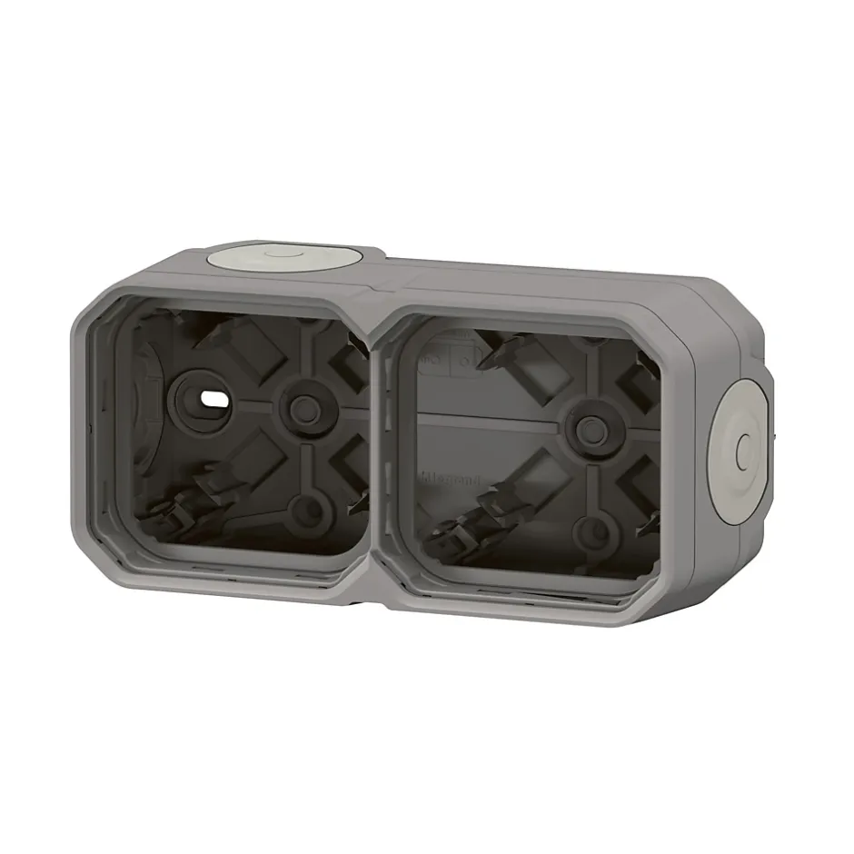 - Boîtier saillie étanche Plexo 2 postes, conçu pour montage horizontal ou vertical sans cloison.