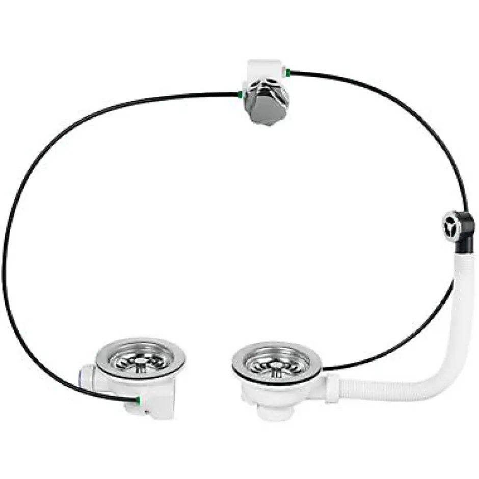 Pour évier 2 bacs Ø90 mm (grès, synthèse, inox), avec commande à câble, bouton de commande automatique chromé et 2 bondes à panier en inox dont 1 avec trop-plein rond. Tube de trop-plein souple L.300 mm, et grille de trop-plein ronde en ABS chromé.