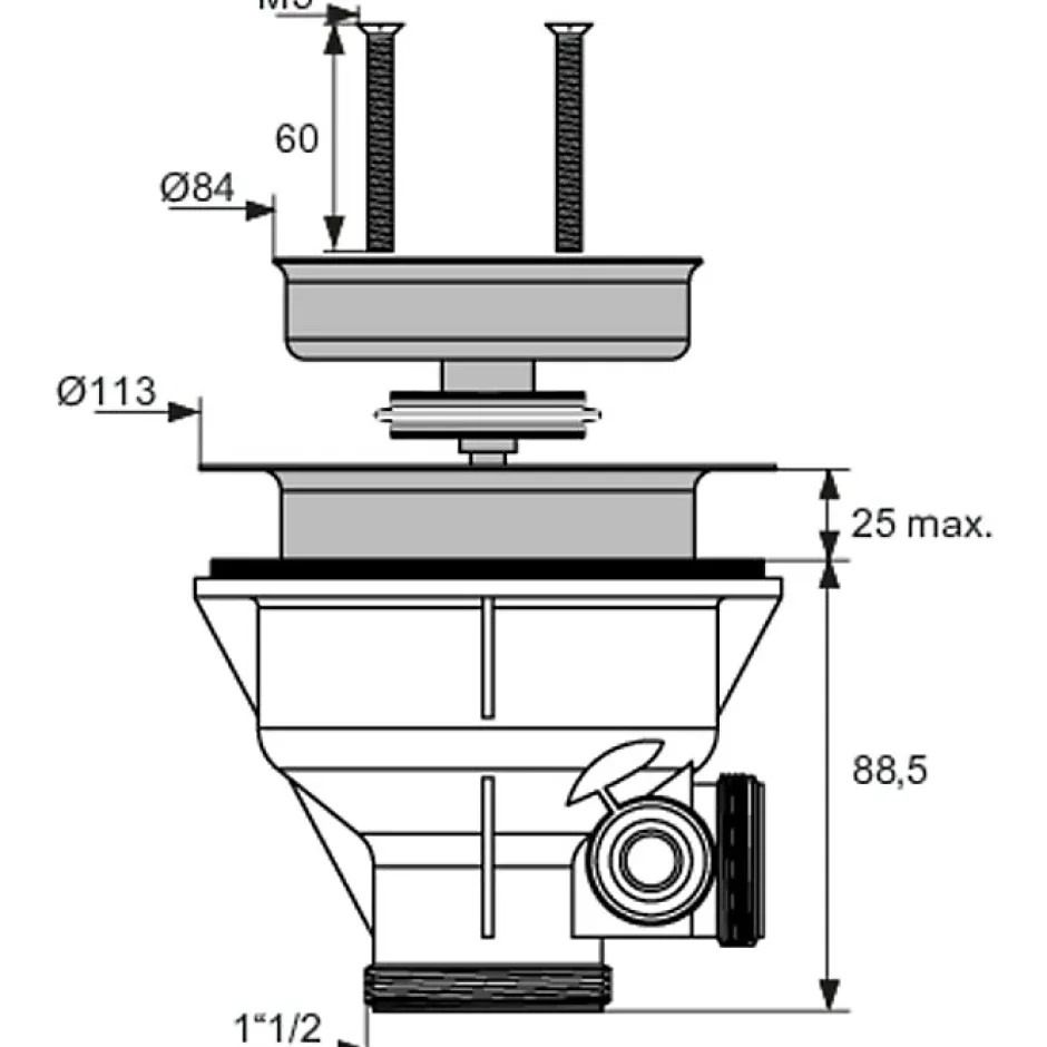 Bonde évier diam. 90 mm À panier avec clapet coulissantCuvette inox diam. 113 mmSerrage 0 à 25 mmVis inox M5 x 60 mmPanier inox diam. 84 mmDébit : 33 l/mnH. sous évier 88,5 mmSpécial évier matériaux épais