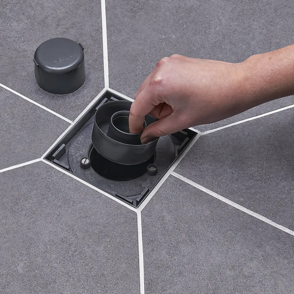 - La grille en inox, haute qualité, est ajustable grâce à sa rehausse pour des carreaux jusqu’à 12 mm et apporte design et durabilité à la douche.