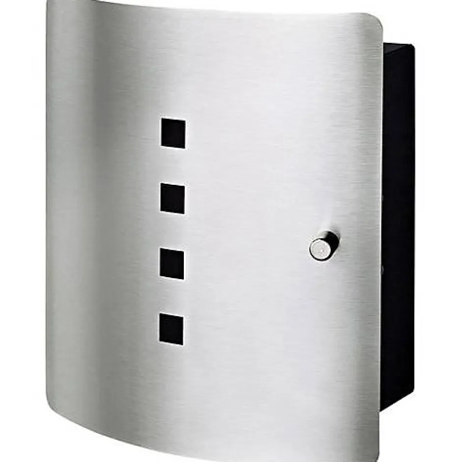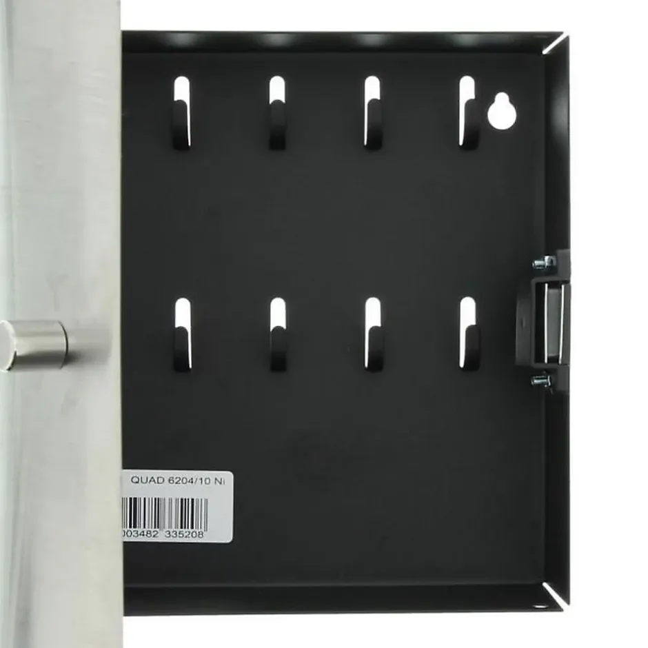 Boîte à clés Burg Wächter Quad 6204/10 Ni – Fermeture magnétique, porte en acier inoxydable et boîtier noir en tôle d’acier. Équipée de 10 crochets pour organiser plusieurs jeux de clés, design fin et montage mural. Couleur acier/noir, dimensions 70 x 240 x 210 mm, matériau inoxydable, résistance à la corrosion.