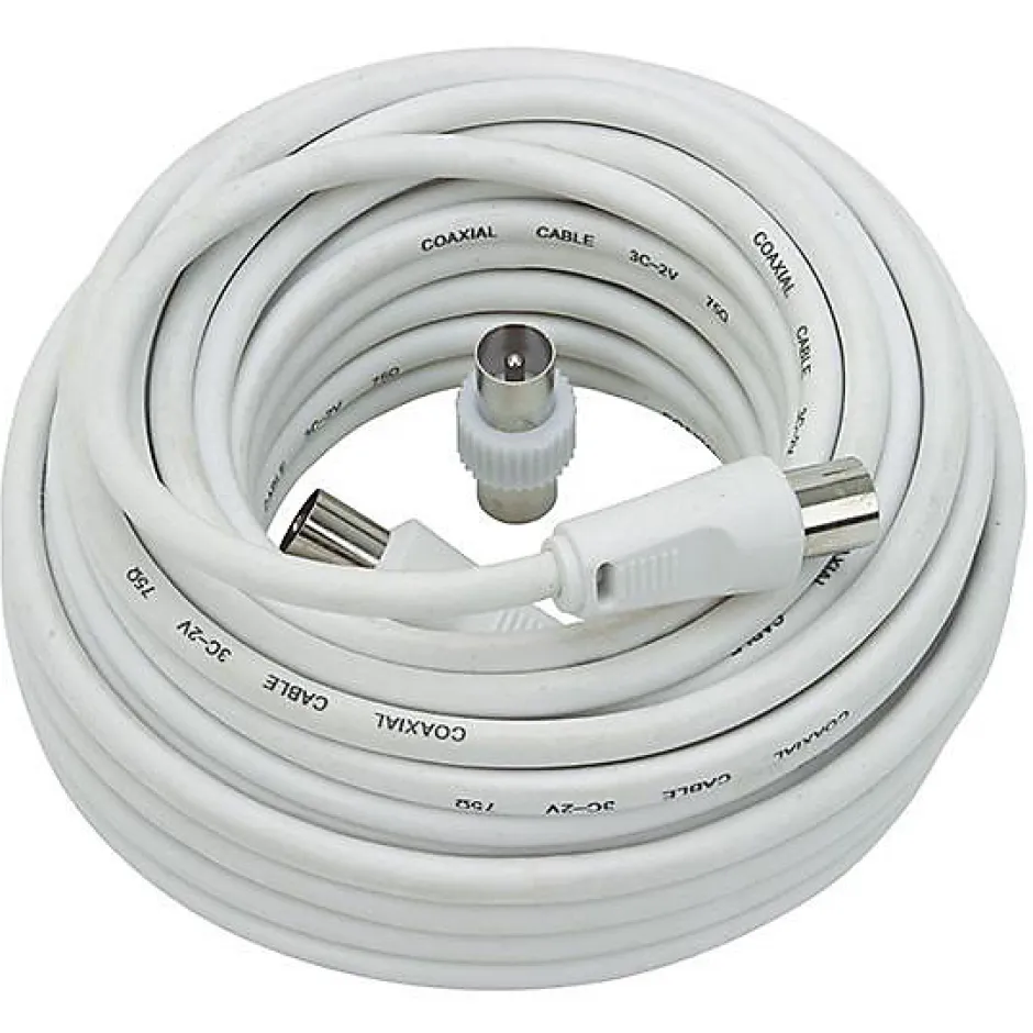 Câble coaxial Tv 10 Mètres + adaptateur.Prolongateur / Câble universel de connexion de télévision ou de radio récepteur sur les prise d’antenne.Caractéristiques :Câble de 10 mètres (mâle / femelle)Adaptateur (mâle / mâle)
