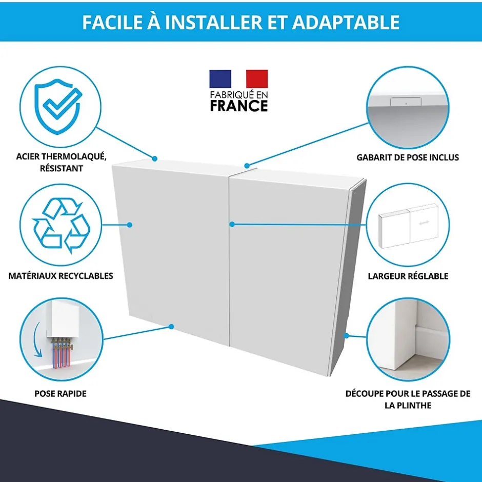 Habillage pour nourrices – Idéal pour dissimuler élégamment les tuyaux et canalisations verticales. Facile et rapide à installer, il assure une finition propre et esthétique de vos installations. Vérifiez attentivement les dimensions extérieures et intérieures pour assurer la compatibilité avec votre installation. Avantages :✅ Fabrication 100% française✅ Rapide à poser et à retirer (2 vis invisibles suffisent à le fixer)✅ Gabarit de pose intégré au produit. Il suffit d’un crayon et d’une perceuse✅ Discret, plus économique qu’un habillage bois, il résiste à l’humidité✅ Réglable en longueur✅ Matière recyclable : un produit conçu pour durer tout en respectant l’environnementCaractéristiques techniques : Dimensions hors-tout : H. 450 x L. 605 à 1150 x P. 150 mm Taille : 2 Matière : Acier Peinture thermolaquée grain cuir Blanc RAL 9003 Poids : 5,35 kg Epaisseur : 0,8 mm Également disponible en d’autres dimensions