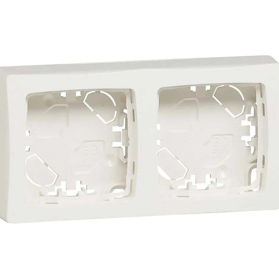 Cadre saillie LEGRAND gamme ASL 2 postes blanc mat (réf. 080292) en thermoplastique, IP2X / IK02, pour rénovation ; montage horizontal ou vertical, entrées câbles défonçables acceptant jusqu’à 6 x 2,5 mm², livré bornes ouvertes, utilisation intérieure -5 à 40 °C.