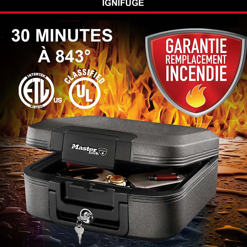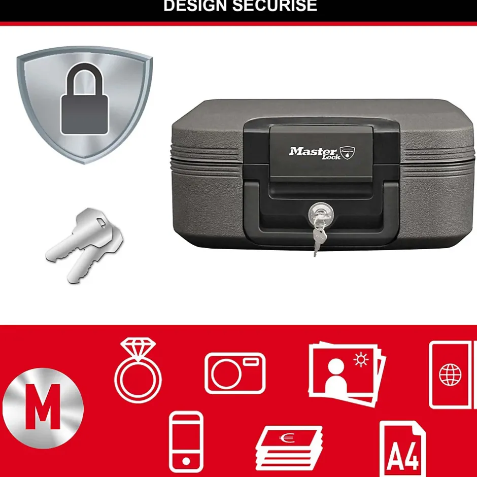 Le caisson de sécurité format M Master Lock LCHW20101 protège vos documents importants (convient aux documents au format A4), supports média (Clé USB, CD, disques durs externes) et objets de valeur (papiers d’identité, passeports, livrets de famille, photos) contre le feu et les inondations. La poignée intégrée permet de le transporter très facilement, sa taille et sa couleur le rende également discret dans une armoire ou dans un tiroir. Elle peut être posée ou fixée au sol (kit de fixation non fourni). Cette mallette de sécurité dispose d’une serrure à clé (2 clés fournies). Ce coffre de sécurité est homologuée UL/ETL et assure une protection contre le feu (30 minutes à 843°C) et l’immersion. Master Lock offre une garantie de remplacement après incendie à vie en plus de la garantie 2 ans limitée. La propriété anti-feu du coffre est assurée par un remplissage des parois au ciment, il n’est pas rare que lors du transport un peu de poussière apparaisse dans le coffre.