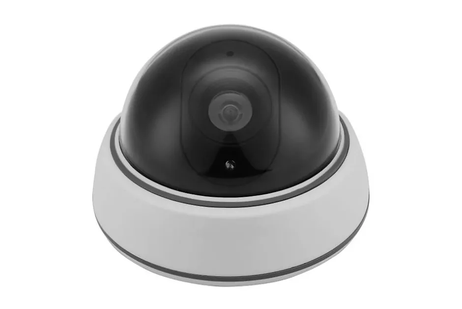 Caméra factice dôme LINK2HOME avec LED rouge clignotante simulant une vraie caméra pour dissuasion. Boîtier en plastique blanc, dôme fumé, montage mural ou plafond, alimentation par 3 piles AA (non incluses). Compacte et légère, fournie avec gabarit, vis, chevilles, notice multilingue et autocollant CCTV. Idéale pour renforcer la sécurité sans installation électrique.