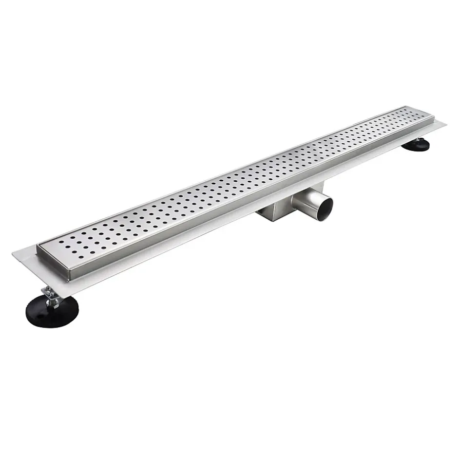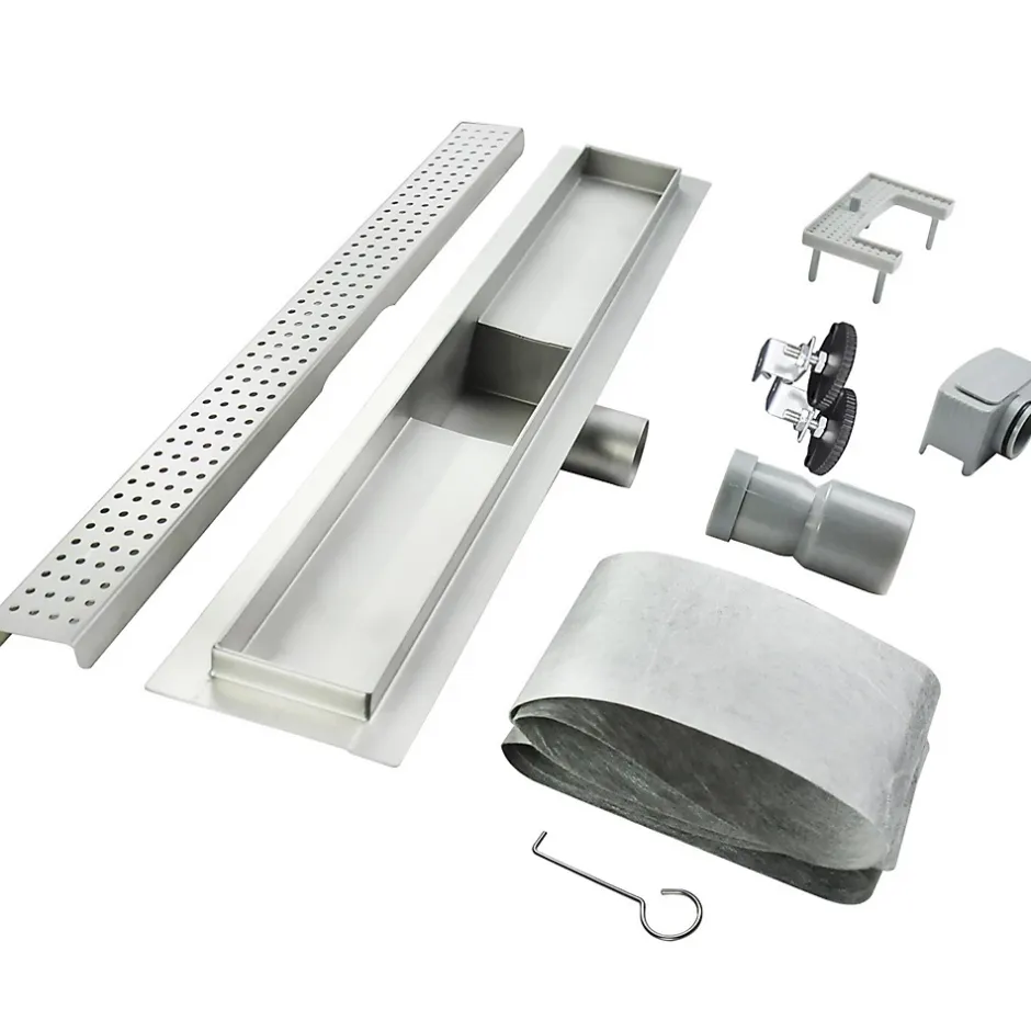 HOXY CANIVEAU DOUCHE À L’ITALIENNE MOTIF EN POINTILLÉ L.50 CM AVEC SIPHON ANTI-ODEURS + FILTRE – Existe en plusieurs longueurs (de 50 à 120 cm). Le caniveau de douche à encastrer HOXY se distingue par son panneau de drainage amovible, motif gille perforée. Grâce à sa bride périphérique, le raccord entre le sol et le drain est à la fois stable et étanche. Ce caniveau de douche offre une capacité de drainage élevée (36L/mn). Il dispose d’un siphon anti-odeurs et d’un filtre à cheveux amovible pour un confort d’utilisation optimale. Il est livré avec 1 membrane d’étanchéité et 2 pieds d’ancrage réglables en hauteur. CARACTÉRISTIQUES – Matériau : acier inoxydable, durable et anti-corrosion – Installation : à encastrer au sol – Hauteur minimale d’installation : 68 mm – Longueurs au choix (cm) : 50, 60, 70, 80, 90, 100, 110, 120 – Panneau de drainage amovible motif grille perforée Capacité de drainage performante, jusqu’à 36 L/min Siphon anti-odeur intégré Filtre à cheveux et à résidus amovible inclus 2 pieds d’ancrage réglables en hauteur (de 68 à 80 mm) – Raccordement : DIN pour le drain 40/50 (adaptateur DN40 → DN50) – Crochet fourni pour retirer le panneau amovible – 1 membrane d’étanchéité incluse – Poids : de 2,1 à 4,2 kg selon la dimension choisie – Instructions de montage illustrées incluses – Garantie : 2 ans INFOS LIVRAISON – Pas de livraison sur les îles. Livraison suivie (email et SMS) 1 colis. À réception, vérifiez en détail l’état de la marchandise (déballez les cartons) en présence du livreur. En cas d’incident, refusez le ou les colis abimés (prenez des photos) et inscrivez le motif précis sur le bon de livraison, puis contactez-nous immédiatement.