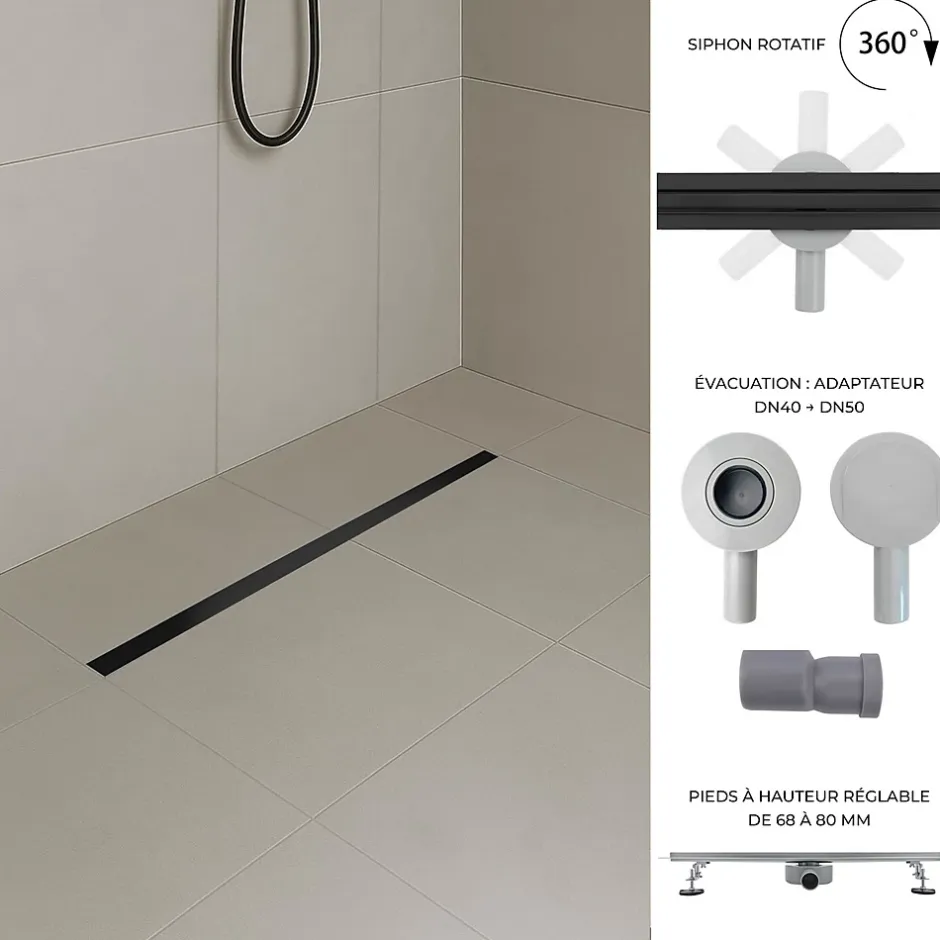 SAMY CANIVEAU DE DOUCHE À ENCASTRER NOIR L.50 CM, PANNEAU DE DRAINAGE ÉTROIT-COMPACT EN INOX AVEC FILTRE + SIPHON 360° – Existe en différentes longueurs (de 50 à 120 cm). – Le caniveau de douche noir encastrable en acier inoxydable SAMY dispose d’un panneau de drainage au design discret et amovible pour faciliter le nettoyage. Grâce à son siphon orientable à 360°, le montage s’adapte facilement à tous les types d’installations. Son drain d’évacuation offre un débit performant jusqu’à 36 L/min. Il est livré avec 2 pieds d’ancrage réglables en hauteur, un système anti-odeur (reflux canalisation) et un filtre à cheveux amovible. – CARACTÉRISTIQUES- Composition : acier inoxydable 304, coloris noir mat – Installation : à encastrer au sol – Hauteur minimale d’installation : 68 mm – Longueurs au choix (cm) : 50, 60, 70, 80, 90, 100, 110, 120 – Siphon orientable à 360° – Panneau de drainage compact et amovible, finition noir mat – Rail d’évacuation faible encombrement – Capacité de drainage performante jusqu’à 36 L/min – Siphon anti-odeur intégré – Filtre à cheveux et à résidus amovible inclus – 2 pieds d’ancrage réglables en hauteur (de 68 à 80 mm) – Raccordement : DIN pour le drain 40/50 (adaptateur DN40 → DN50) – Crochet fourni pour retirer le panneau amovible – 1 membrane d’étanchéité incluse – Instructions de montage illustrées incluses – Garantie : 2 ansINFOS LIVRAISON – pas de livraison sur les îles. Livraison suivie (email et SMS) – 1 colis – À réception, vérifiez en détail l’état de la marchandise (déballez les cartons) en présence du livreur. En cas d’incident, refusez le ou les colis abimés (prenez des photos) et inscrivez le motif précis sur le bon de livraison, puis contactez-nous immédiatement.