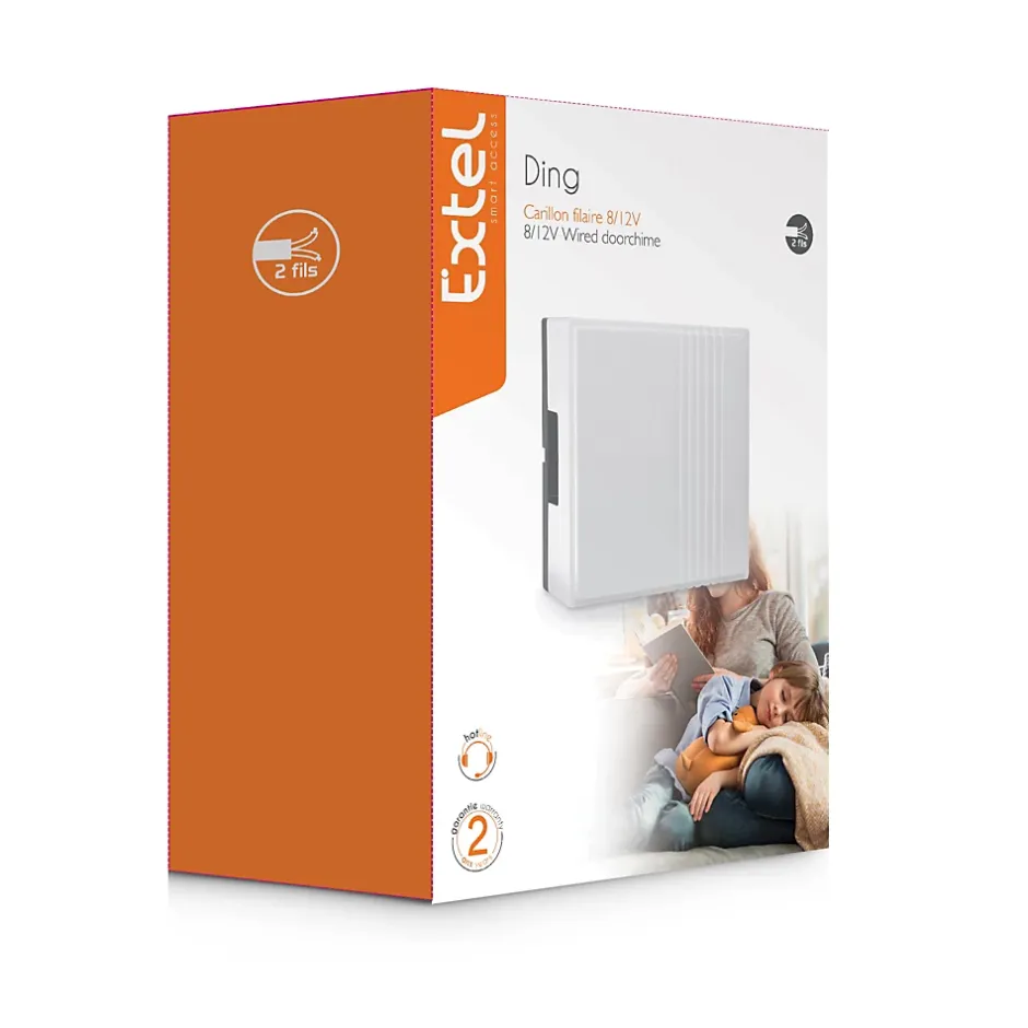 Installez simplement votre carillonAvec une installation rapide et facile sur deux fils entre le carillon Ding et un bouton d’appel compatible (réf. 710803), cet accessoire est facile à mettre en place puis à utiliser. Remplacez votre carillon défectueuxCet accessoire est parfait pour remplacer un carillon ancien ou défectueux quand votre bouton d’appel fonctionne encore. Pas besoin de racheter une solution complète, ce carillon prolonge la durée de vie de votre dispositif. Deux tons pour accueillir votre visiteurLorsqu’un visiteur sonne, une mélodie se fait entendre. Vous aurez le choix entre deux sonneries comme alerte sonore.Fonctionne avec un carillon et un transformateur externeCe carillon Ding fonctionne avec un transformateur externe 8-12 VAC (non fourni) et un carillon Extel compatible (non fourni, réf. 710803).Découvrez le contenu du kit1 carillon filaire 8-12 volts1 manuel d’utilisationVis et chevilles pour la fixationRemplacez votre ancien carillon défectueux et soyez averti de la venue d’un visiteur avec le carillon filaire Ding d’Extel. Son installation simple sur deux fils et son design sobre s’intègre parfaitement à votre mur intérieur. Choisissez parmis deux sonneries d’appel pour être averti d’une visite. Attention il vous faut vous munir d’un transformateur externe 8 à 12 VAC et du bouton d’appel qui sont tous deux non fournis pour pouvoir l’utiliser.