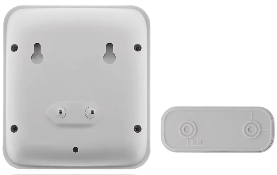 Blanc, Carillon radiofréquence sans fil 433,92MHz, Nombre de mélodies : 1 de type >, Portée : 100m env. (en champ libre), Alimentation : secteur 220V~ 50Hz / Bouton poussoir sans fil 433,92MHz, Etanchéité : IP44, Alimentation : 1 pile type CR2032 (fournie)