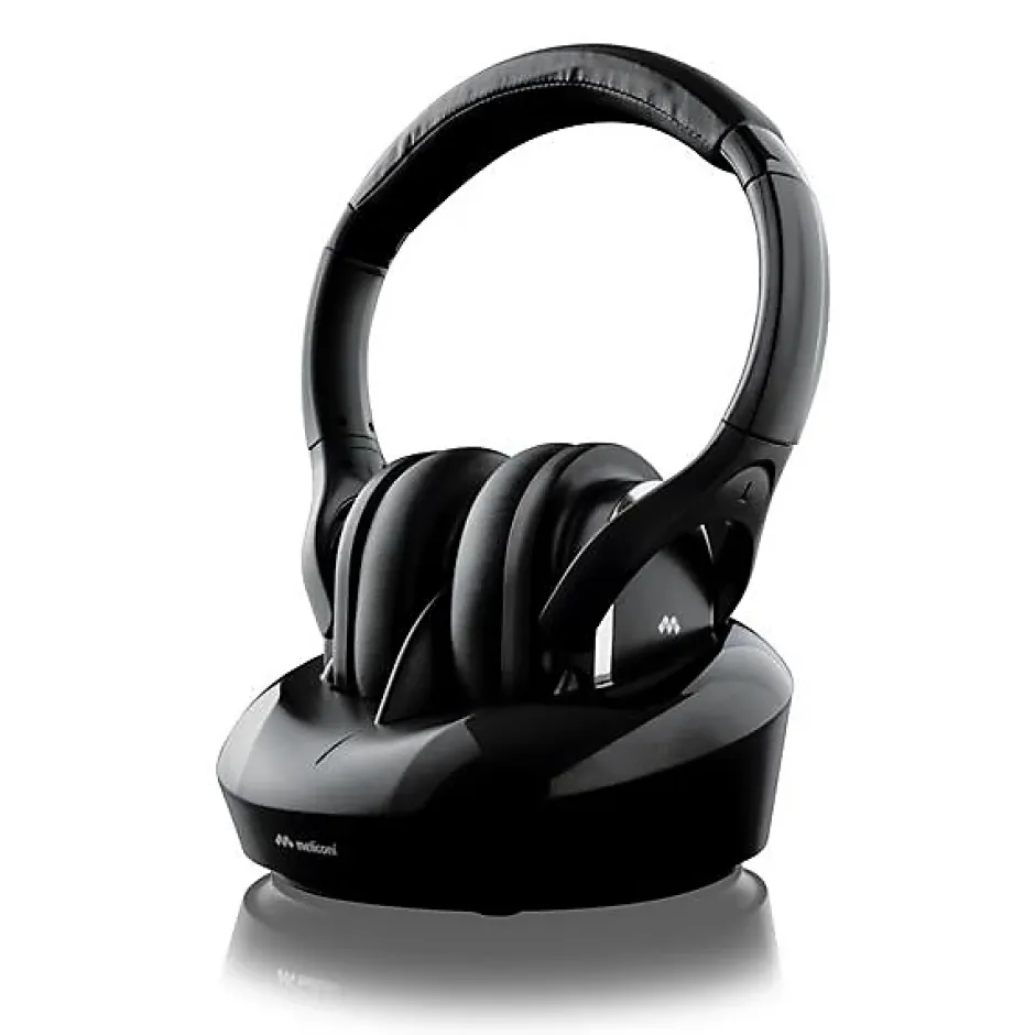 Système sans fil qui permet d’écouter une source audio sans l’encombrement des câbles et laisse une totale liberté de mouvement.Le signal traverse les murs et les plafonds.Distance de fonctionnement jusqu’à 100 mètres en champ libre.Reproduction audio stéréo sans interférence (dans des conditions optimales).Connexion rapide à la télévision, décodeur, DVD, Blu-ray et autres sources audio analogiques et numériques.Le casque dispose de 3 entrées : numérique optique, numérique coaxiale et analogique, il est compatible avec presque tous les modèles de téléviseurs.Station d’accueil et de recharge peu encombrante, idéale pour ranger les écouteurs après utilisation.Environ 8 heures d’utilisation continue à volume sonore moyen avec batterie lithium-polymère. Batterie longue durée, 500 cycles de charge.Fonction de contrôle du volume sur le casque.Excellente isolation acoustique contre les bruits ambiants.Arceau ajustable pour un positionnement idéal lors d’une utilisation prolongée.Léger, ergonomique et confortable, avec des coussinets de forme ovoïde qui s’adaptent parfaitement à la morphologie de l’oreille.Design élégant et finitions raffinées.Synchronisation automatique de la fréquence entre le casque et la base émettrice (Auto Tuning).Déconnexion automatique du casque en cas d’absence de signal.Trois canaux de transmission sont disponibles pour éviter les interférences.Le casque peut être aussi utilisé comme un casque filaire standard.Poids du casque : 212g