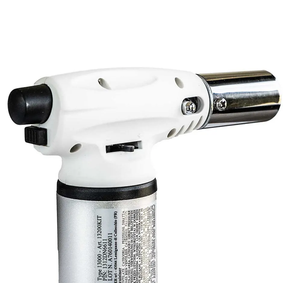 Élevez vos créations culinaires avec notre brûleur de cuisine haut de gamme, conçu pour les chefs amateurs et professionnels. Ce brûleur est équipé d’un allumage piézo intégré et d’un grand réservoir de 13g, offrant puissance, précision et sécurité.Points Forts :- Sécurité Enfant : Doté d’un verrouillage de sécurité spécialement conçu pour protéger les plus jeunes, ce brûleur vous assure une tranquillité d’esprit lors de son utilisation.- Bouton de Fonctionnement Continu : activez la flamme continue grâce à un bouton dédié, vous permettant de concentrer toute votre attention sur la préparation de vos plats.- Réglage de l’Intensité de la Flamme : Adaptez la flamme selon vos besoins spécifiques.- Fonction Flamme Douce : La régulation de l’air intégrée permet de générer une flamme douce et stable.- Recharge avec Cartouche de Gaz : Le chalumeau est livré avec une cartouche de gaz butane de 90g incluse.Avantages :- Précision et Polyvalence : La flamme réglable offre une grande précision, idéale pour les applications culinaires variées.- Légèreté et Durabilité : Conçu en aluminium, ce brûleur est à la fois léger et résistant, prêt à supporter une utilisation intensive.- Utilisation Facile : L’allumage piézoélectrique assure une mise en route simple et rapide à chaque utilisation.Utilisations Idéales :- Caramélisation des Gâteaux : Parfait pour créer une croûte sucrée et croustillante sur vos desserts.- Brunissage des Viandes : Offrez à vos viandes une finition dorée impeccable.- Fondre et Chauffer : Pratique pour faire fondre du fromage, du sucre, ou chauffer d’autres ingrédients délicats.Caractéristiques Techniques :- Puissance : 0.7 kW- Matériau : Aluminium- Allumage : Piézoélectrique – Flamme : Réglable- Régulation de l’air ajustable- Flexibilité : Fonctionne en toutes positions- Consommation : 50g/h- Type