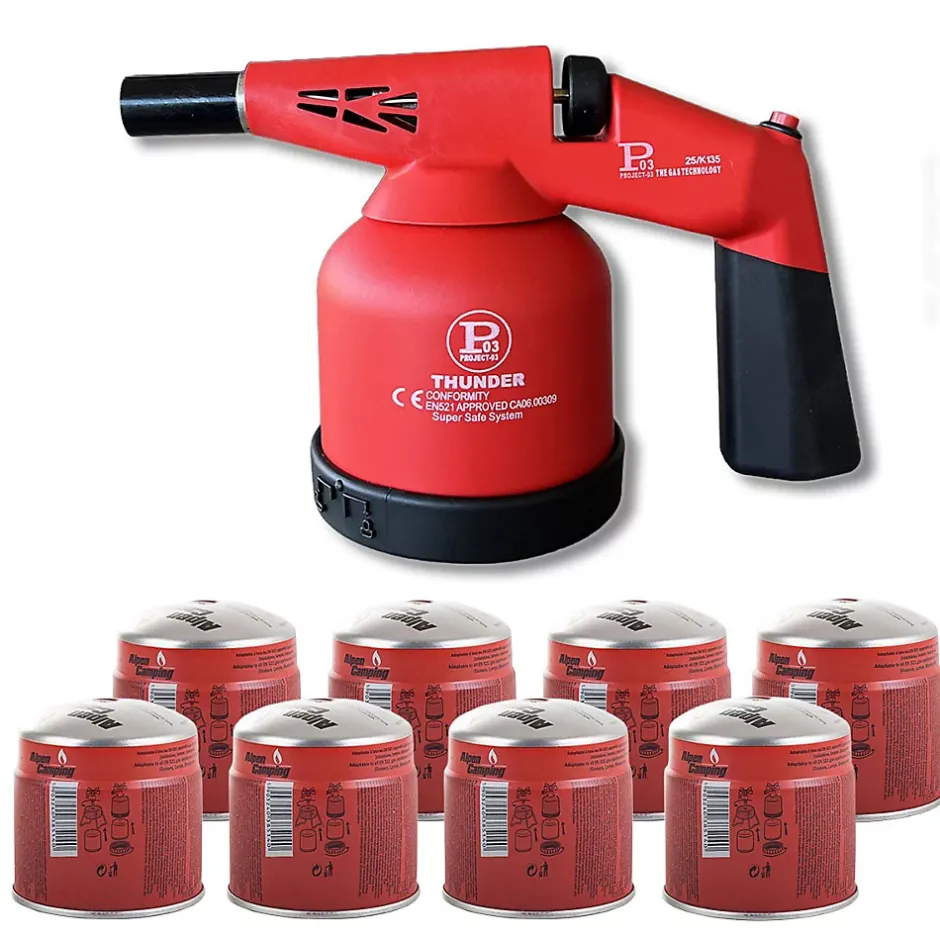 - PACK COMPLET PRÊT À L’EMPLOI : ce kit comprend une lampe à gaz THUNDER et 8 cartouches de gaz 190 g norme EN417 pour utiliser immédiatement votre chalumeau gaz lors de travaux de bricolage, plomberie ou pour l’allumage d’un barbecue ou d’une cheminée.