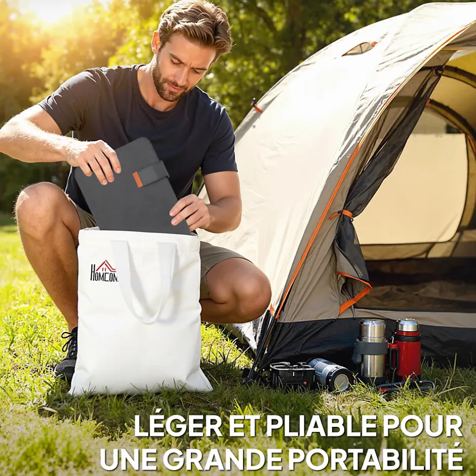 Fatigué que votre téléphone s’éteigne en randonnée ? Le chargeur solaire pliable HOMCOM, étanche IP67, recharge rapidement vos appareils au soleil. Ultraléger, il s’attache à votre sac, offrant une énergie mains-libres, vous permettant de vous aventurer sans souci.Caractéristiques :- Ce panneau solaire portable offre une charge rapide de 36 W via les ports Type-C et USB-A, éliminant ainsi vos soucis d’alimentation en extérieur – Indice d’étanchéité IP67, garantissant une durabilité optimale sous la pluie et la poussière – Ce chargeur solaire portable se plie de manière compacte comme un magazine et s’accroche facilement à votre sac à dos pour la recharger – Surface en ETFE solide et résistante à l’usure, garantissant une efficacité de conversion élevée et durable – Boîtier de jonction orange vif, très visible et facile à trouver dans la nature – Livré en kit complet avec mousquetons, prêt pour votre voyage vers l’énergie verte – Assemblage requis Spécifications :- Couleurs : gris, orange- Matériaux : ETFE, EVA, silicium monocristallin, carte FR4, tissu imperméable- Dimensions totales : 89,8L x 27,9l x 1P cm- Dimensions pliées : 27,9L x 20l x 3,05H cm- Puissance maximale : 36 W- Tension de fonctionnement : 13,2 V- Quantité de puces : 24 pcs- Taux de conversion : 24,6 %- Port de sortie : 1 x Type-C (5V/3A max, 9V/3A max, 12V/2,5A max)- Indice de protection : IP67- Température de stockage : 10-35 ?- Humidité de stockage : ? 60 %- Température de fonctionnement : -10 à +60 ?- Assurance : 12 mois- Réf. : 84F-007V00GY