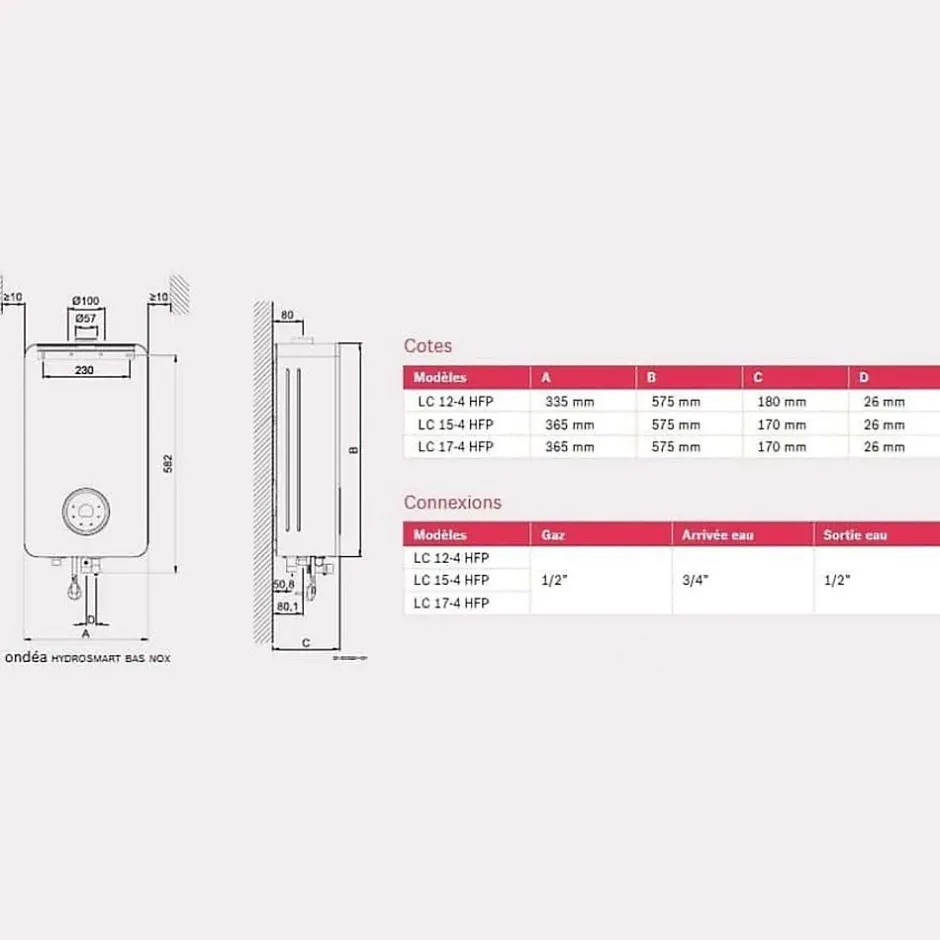 Les chauffe-bains ONDEA HYDROSMART BAS NOX sont équipés d'un brûleur à flamme refroidie. Une technologie unique et brevetée qui permet de limiter les émissions de NOX dans l'atmosphère et qui est compatible avec les exigences de la directive ERP 2018.Ils intègrent tous les dispositifs de sécurité : électrode d'ionisation, sécurité thermique, sonde de température ECS, limiteur de température, boitier de commande, sonde de température d'air interne.Le remplacement des chauffe-bains est d'une grande simplicité grâce aux connexions hydrauliques et aux conduits d'évacuation de fumée qui restent identiques.La gamme ONDEA se décline en de nombreux modèles qui permet donc de s'adapter à toutes les exigences de confort de l'utilisateur.Les nouveaux chauffe-bains ONDEA HYDROSMART BAS NOX sont équipés d'une interface de régulation digitale qui permet de contrôler le confort du bout des doigts.Dimensions : (L x H x P)LC12 : 335 x 180 x 575 mmLC15 : 365 x 170 x 575 mmLC18 : 365 x 170 x 575 mmPression d'eau ( Mini/Maxi) : 0,1/12 barsCLASSE ENERGIE AGarantie 2 ans : contre vices de fabrication, hors pièces d'usure.