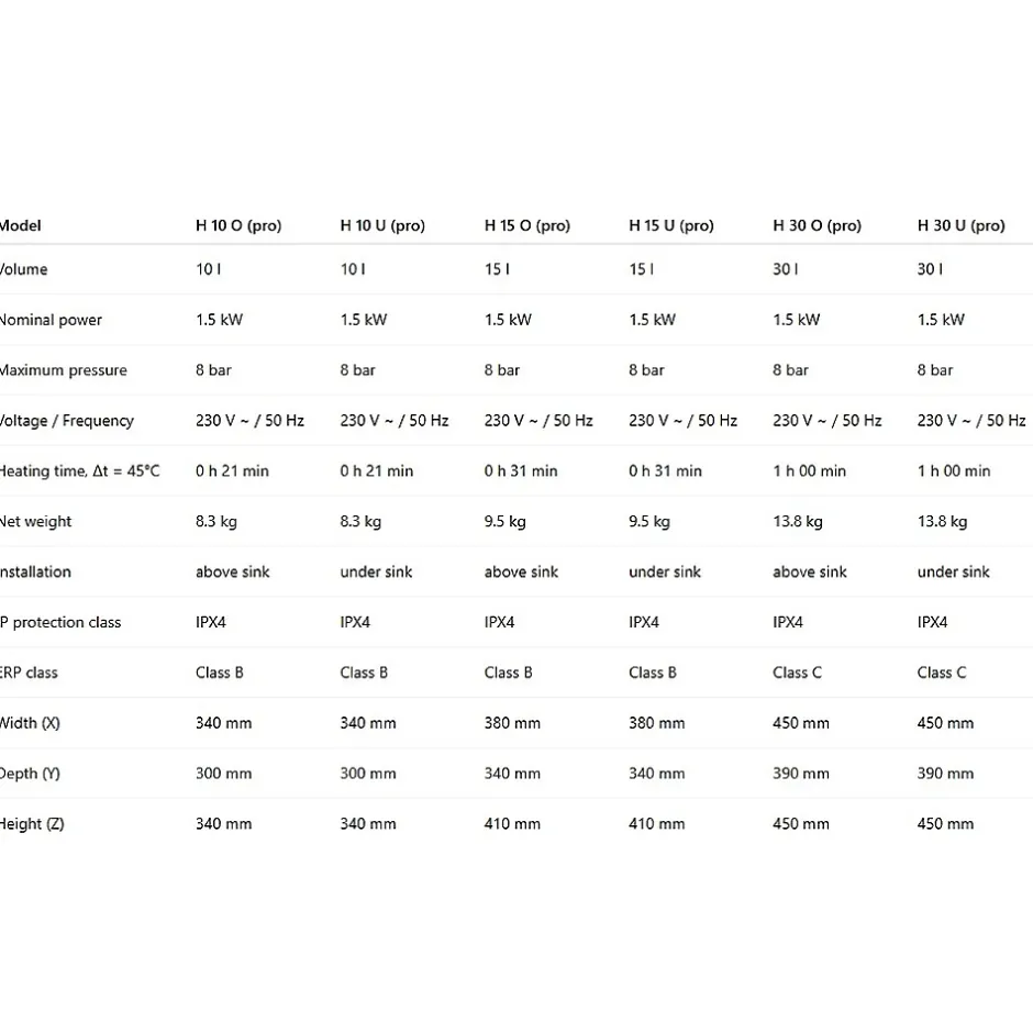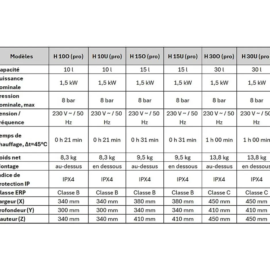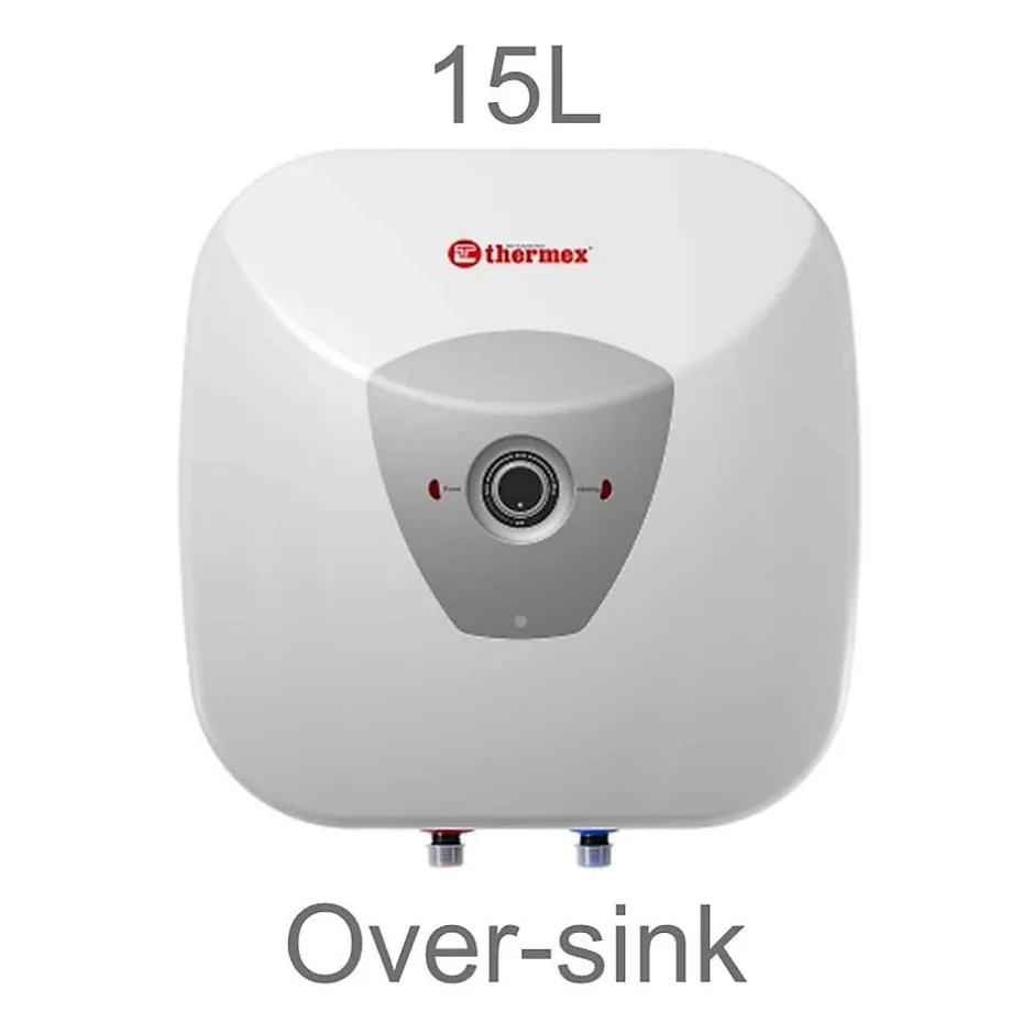 HPRO15-O : Chauffe-eau électrique compact HIT PRO 15L Thermex – Installation au-dessus de l’évier (arrivées d’eau en bas)Thermex HIT PRO — solution compacte pour disposer d’eau chaude dans une cuisine, une salle de bains, un bureau ou une résidence secondaire. Idéal en l’absence de réseau d’eau chaude.• Format compactS’installe au-dessus ou en dessous de l’évier.• Chauffage rapide1,5 kW pour atteindre 75 °C en 21 à 60 min selon le volume. Parfait pour vaisselle, toilette, mains.• AutonomieConvient aux maisons, bureaux, résidences — là où seule l’eau froide est disponible.• ÉconomiqueClasse énergétique B/C, consommation journalière de 2,63 à 2,78 kWh.• Sûr et fiableJusqu’à 8 bars, protection IPX4, thermostat intégré, sécurité anti-surchauffe.• SilencieuxFonctionnement à 15 dB — quasi inaudible.• Design universelModèles sous/au-dessus de l’évier, même design, raccords diffèrent.Pourquoi choisir Thermex HIT PRO ?Chauffage rapideFormat compactInstallation facileIdéal pour petits logements, bureaux, locationsMarque fiableVolumes disponibles :10 L — lavabos15 L — usage quotidien30 L — douche, ménageThermex — 70 ans d’expertise. Produits exportés dans 100+ pays. Conformes aux normes européennes.Caractéristiques du chauffe-eau Thermex HIT PRO 15 litresCapacité : 15 lPuissance : 1,5 kWTension / Fréquence : 230 V ~ / 50 HzPression maximale : 8 barsTemps de chauffe (Δt = 45 °C) : 31 minEfficacité énergétique : jusqu’à 33,0 %Classe d’efficacité énergétique : BConsommation annuelle d’électricité (AEC) : 559–568 kWhConsommation journalière : jusqu’à 2,729 kWhRéglage de la température : 75 °CNiveau sonore : 15 dBMontage : modèle O – au-dessus, modèle U – en dessousIndice de protection : IPX4Classe ERP : BDimensions : 380 × 340 × 410 mmPoids : 9,5 kg