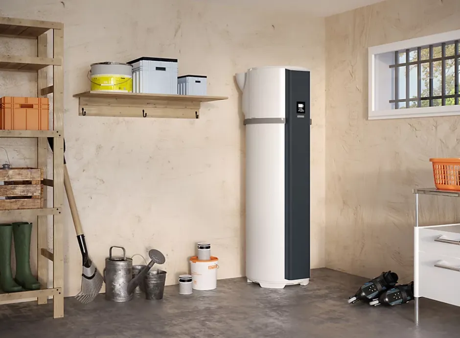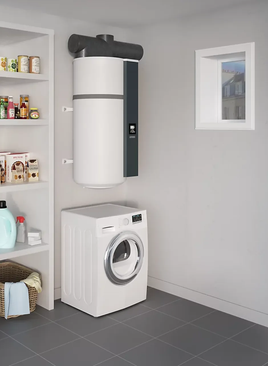 - Chauffe l’eau en puisant les calories de l’air grâce à une pompe à chaleur intégrée.