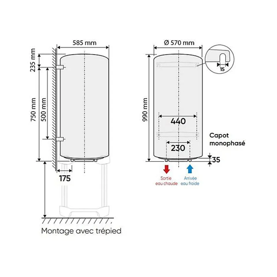 Une multitude de capacités et de configurations, pour répondre aux besoins de tous les foyers. Chaufféo s’adapte à votre logement. Unessentiel à résistance blindée idéal pour les petits budgets. Plus de tranquillité Simple et efficace. De très nombreuses capacités disponibles pour répondre aux besoins de tous les foyers. Garantie 5 ans cuve et 2 ans pièces Plus d’économies Idéal pour les petits budgets Plus de confort Eau chaude rapidement disponible. Plus de design Un design monolithique pour une meilleure intégration. Caractéristiques Volume d’eau 150 litres. Diamètre 513 mm Poids 34kg Dimensions H x L x P : 1155 x 513 x 540 mm Résistance blindée avec protection par anode magnésium. Raccord diélectrique bi-métallique fourni. Plusieurs accessoires disponibles pour camoufler le chauffe-eau.