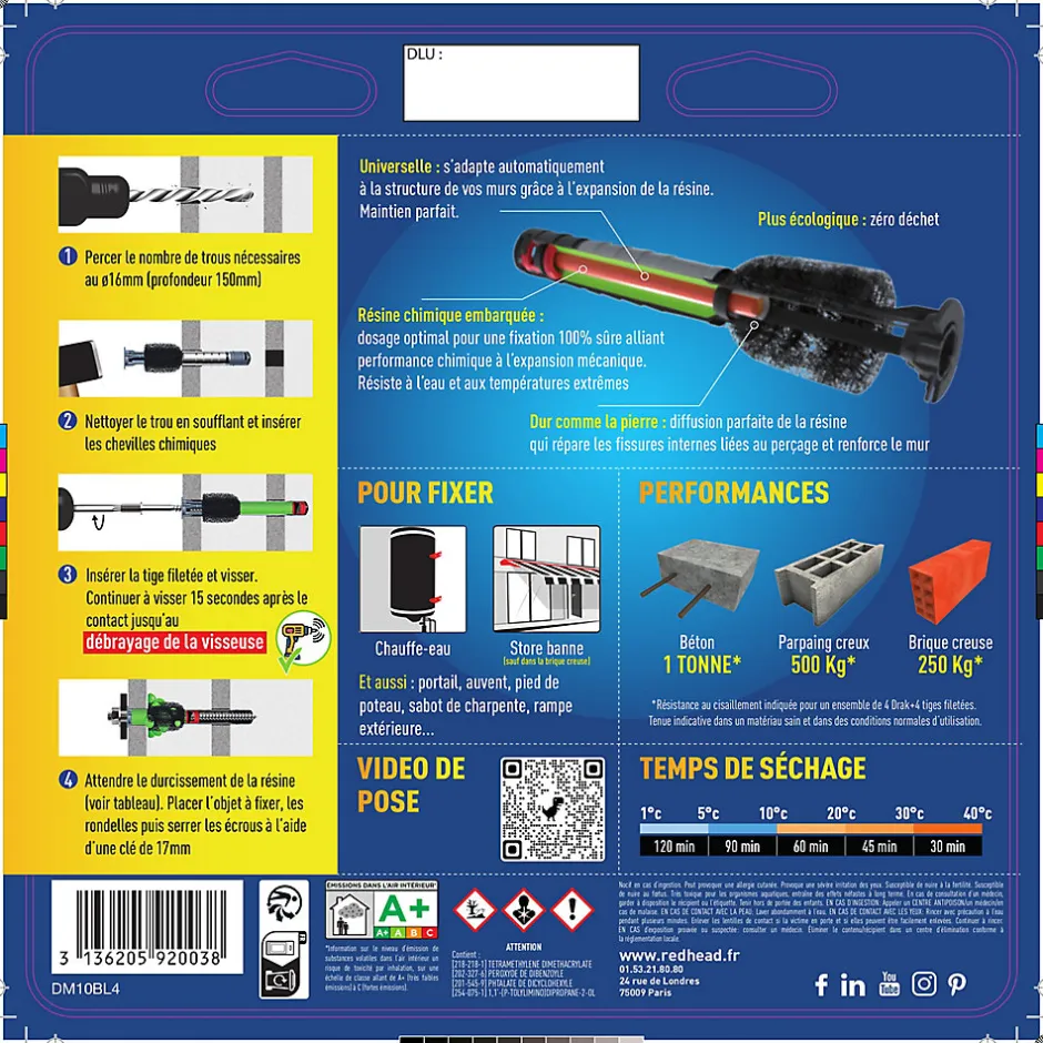 Fixe jusqu’à 1 tonne dans le béton, fonctionne dans tous les types de murs.Idéal pour la fixation de charges lourdes, chauffe-eaux, paraboles, portail, paniers de basket, chaudières, verrières, pieds de poteaux, sabots de charpente, auvents…