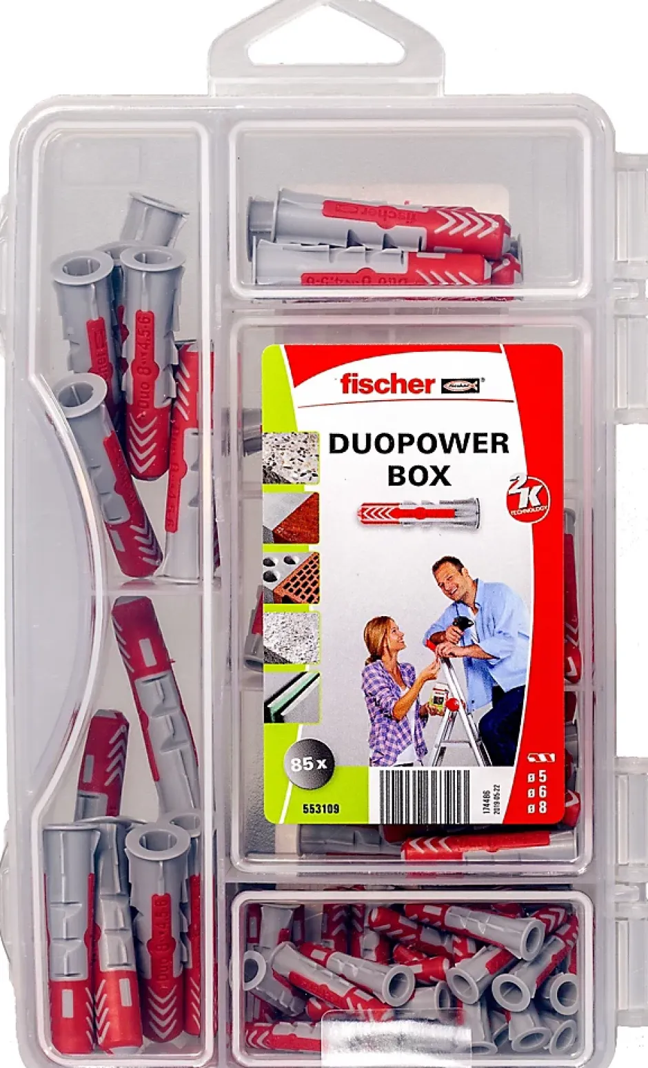 La fischer DuoPower-Box mini contient 30 DuoPower 5 x 25, 35 DuoPower 6 x 30 et 20 DuoPower 8 x 40 compartimentés. La Minibox, fabriquée en plastique de haute qualité et résistant aux chocs, offre un rapport qualité/prix optimal. Pratique, la boîte contient un assortiment sélectionné de chevilles pour les applications et les matériaux de construction les plus fréquents. Grâce au couvercle transparent et aux compartiments, le contenu peut être visualisé en un coup d’œil. Cela permet de gagner du temps et garantit la sélection de l’élément de fixation approprié. La MiniBox se ferme en toute sécurité et peut être rechargée.