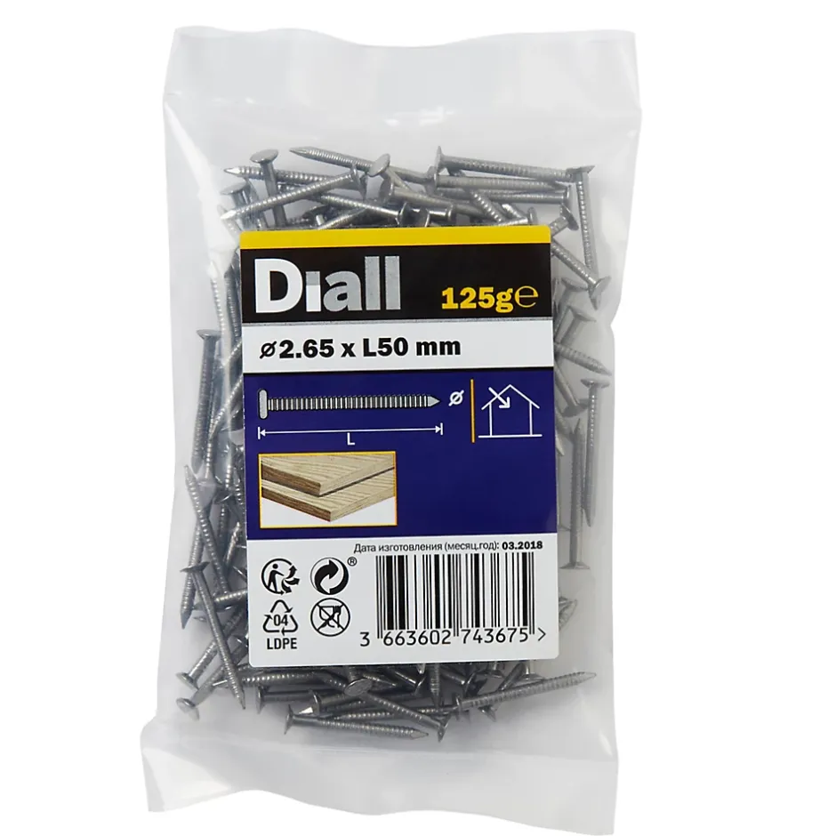 Les clous à tige annelée de ce pack de 125 g sont fabriqués à partir d’acier au carbone. Ils mesurent 50 mm de long et ont un diamètre de 2,65 mm. Recommandés pour une application sur des structures en bois et en extérieur. Ils sont idéaux pour tout un éventail de projets de bricolage.