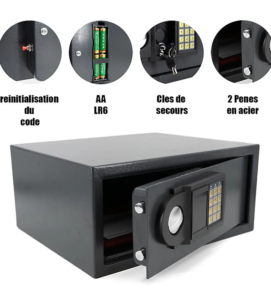 Coffre fort éléctronique de sécurité 25. LCaractéristiques du coffre fort pour ordinateur portable :Couleur : GrisMarque : ReskalModèle : SELMatière : AcierCapacité : 25. LDimension extérieur (Hx. Lx. P) : 190x430x390 mmDimension intérieur (Hx. Lx. P) : 185x425x320 mmPoids : 12 kgCoffre fort idéal pour ordinateur portable 15 poucesOuverture avec serrure électronique Pile fournis2 clés de secoursFixation au sol ou au mur (incluse)Description du coffre fort 25. L Reskal :Le coffre fort 25. L spécial pour PC portable de la marque Reskal représente une solution sûre et pratique pour protéger vos biens de valeur, notamment votre ordinateur portable. Avec ses caractéristiques robustes en acier et sa capacité de 25. L, il offre un espace généreux pour stocker votre équipement en toute sécurité. La serrure électronique garantit un accès facile et sécurisé, tandis que les deux clés de secours fournies offrent une tranquillité d’esprit supplémentaire en cas de besoin. Sa polyvalence permettant une fixation au sol ou au mur ajoute à sa praticité, offrant ainsi une protection fiable et adaptable à vos besoins spécifiques. En somme, le coffre fort 25. L Reskal allie sécurité, praticité et fiabilité pour assurer la protection de vos biens les plus précieux.