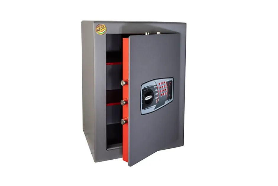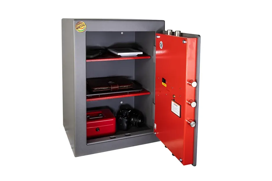 Cadre et porte épaisseur 8 mm.Corps épaisseur 4 mm.Serrure à combinaison électronique digitale certifiée EN 1300 contrôlée par un système électronique à mémoire permanente.Commande d’ouverture/fermeture et clavier à commande affleuranteAlimentation interne avec 4 piles alcalines de 1.5 V AA (non fournies).Alimentation de secours par contact extérieur sur le clavier.Secours par clé d’urgence à double panneton haute sécurité EVO-LOCK avec carte de propriété (2 clés fournies).Signalisation sonore et visuelle pour confirmation des codes, indication d’erreurs et charge insuffisante (Buzzer et Leds).7 pênes tournants anti-sciage en acier nickelé Ø 22 mm.Protection avec plaque d’acier au manganèse au niveau de la serrure et des pênes horizontaux et verticaux.Profil intérieur spécial offrant une résistance plus longue à l’enfoncement de la porte.Soudures internes réalisées par un système robotisé. Soudure périmétrique continue cadre/corps.2 tablettes intérieures amovibles.Trous de fixation au dos et à la base (4+4).Chevilles fournies.Peinture époxy au four.Dimensions intérieures : H 59 x L 42 x P 35 cmDimensions porte : H 51 x L 33 cmFabriqué en Italie.