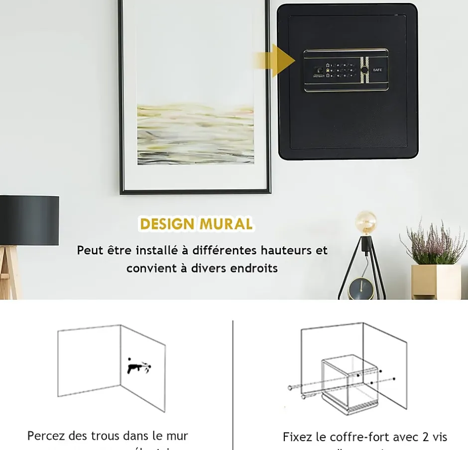 Notre coffre-fort est en acier au carbone avec 4 boulons de verrouillage de 27 mm offre une protection fiable pour votre propriété. A l’intérieur, la surface en cuir du coffre-fort offre une couche de protection supplémentaire, garantissant que les bijoux, souvenirs ou autres objets délicats sont protégés des rayures ou des dommages. Vous pouvez déverrouiller la porte en entrant 3 à 8 mots de passe ou en utilisant la clé d’urgence et en tournant le passe-partout.