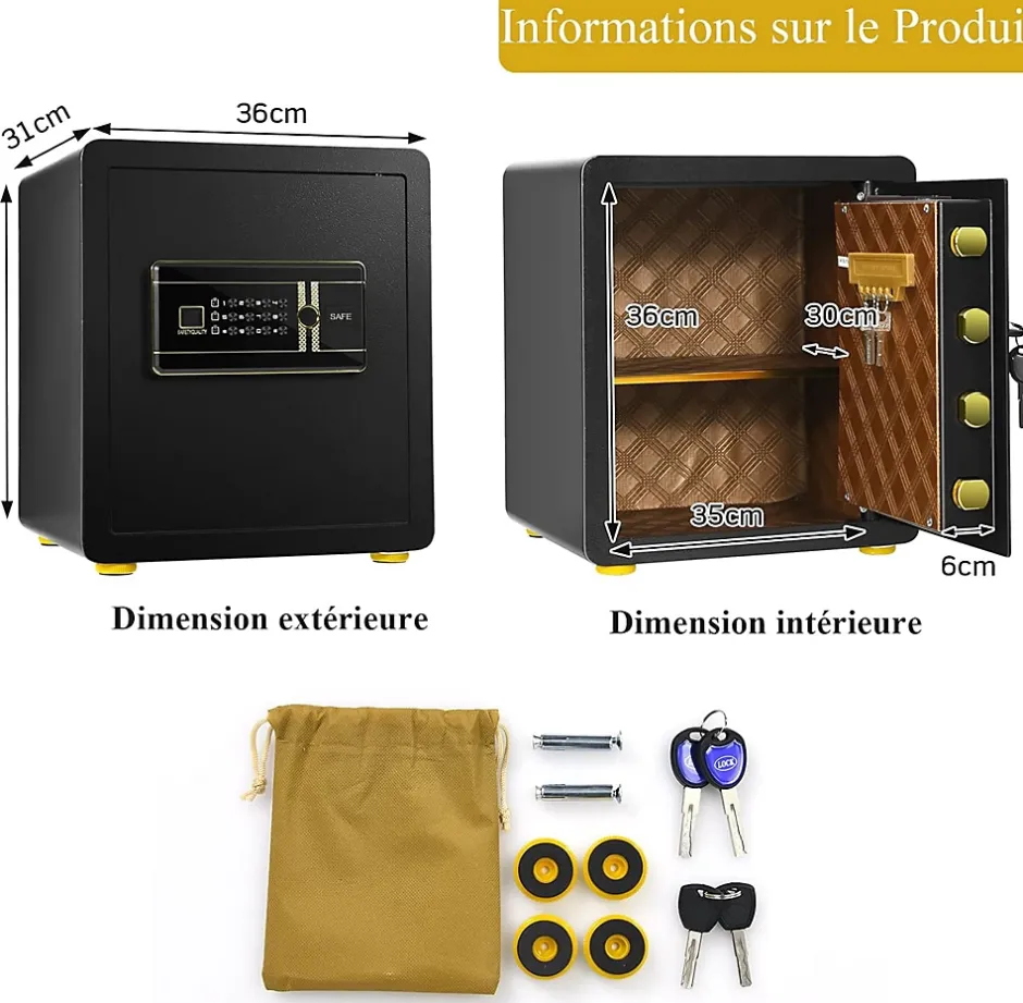 - Espace vaste et flexible : La taille intérieure est de 34 x 30 x24 cm, ce qui offre un grand espace pour stocker toutes sortes d’objets de valeur, tels que de l’argent, les bijoux, les documents juridiques, etc. L’étagère centrale est amovible pour s’adapter à différentes hauteurs d’articles. De plus, il y a des crochets pour les clés derrière les portes.