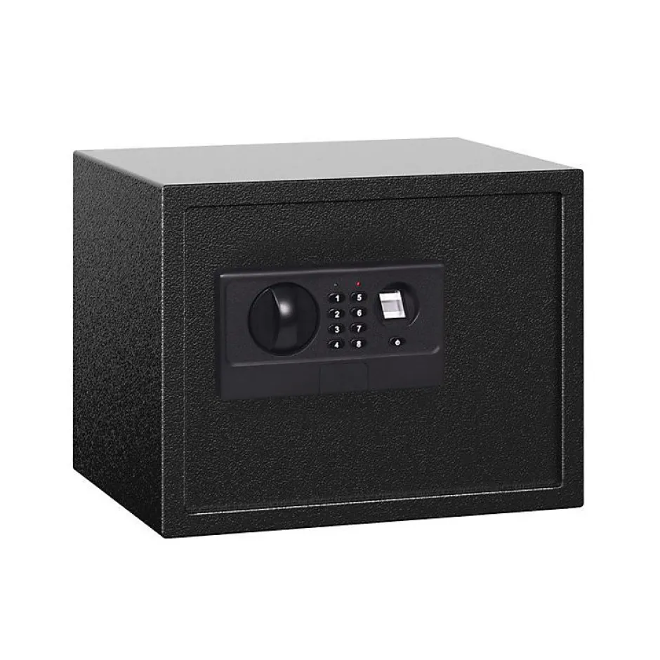 Coffre fort de sécurité, à empreinte digitale de 26 litresA la maison ou au bureau, on a toujours des documents ou objets que l’on souhaite protéger du regard des indiscrets. Ce coffre-fort biométrique est une excellente solution pour mettre en sécurité ce que vous désirez. De taille moyenne, il ne prendra que peu de place dans votre bureau, chambre ou autre pièce. Le coffre-fort biométrique est un coffre de sécurité facile à accrocher au sol ou au mur avec ses trous de fixation pré-percés. Il vous permettra de sécuriser divers documents importants que ce soit de l’argent, clef, porte feuille ou documents grâce à ses dimensions intérieures.Un coffre fort sécuriséNos coffres-forts sont conçus avec trois possibilités d’ouverture:Un système d’identification moderne biométrique ( à empreinte digitale),Un code d’ouverture comme mot de passe,Une clé livrée avec le dispositif.Au final, vous avez le choix d’utiliser 3 différents types d’ouverture pour une meilleure sécurisation de vos biens et documents. Le coffre-fort biométrique est assez épais pour éviter tout genre d’intrusion à l’improviste. De forme rectangulaire, il permettra une résistance aux chocs. Caractéristiques : Capacité de stockage : 26 litresStockage : documents, billets d’argents, bijouxMoyen d’ouverture : biométrique, à clé, à codeForme : rectangulaireFixation : sol et murMatière : acierNorme : CEEpaisseur de la porte : 4 mmEpaisseur de la paroi : 1,4 mmDimensions extérieures (L x h x p) : 38 x 30 x 30Dimensions intérieures (L x h x p) : 37.7 x 29.7 x 24 cmNombre de pêne : 2Poids : 11 kgCouleur : noirLivré avec 2 clefs