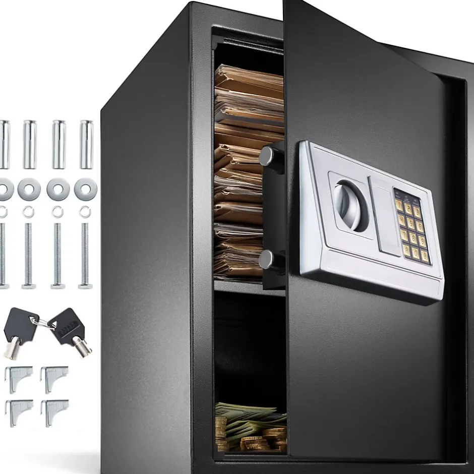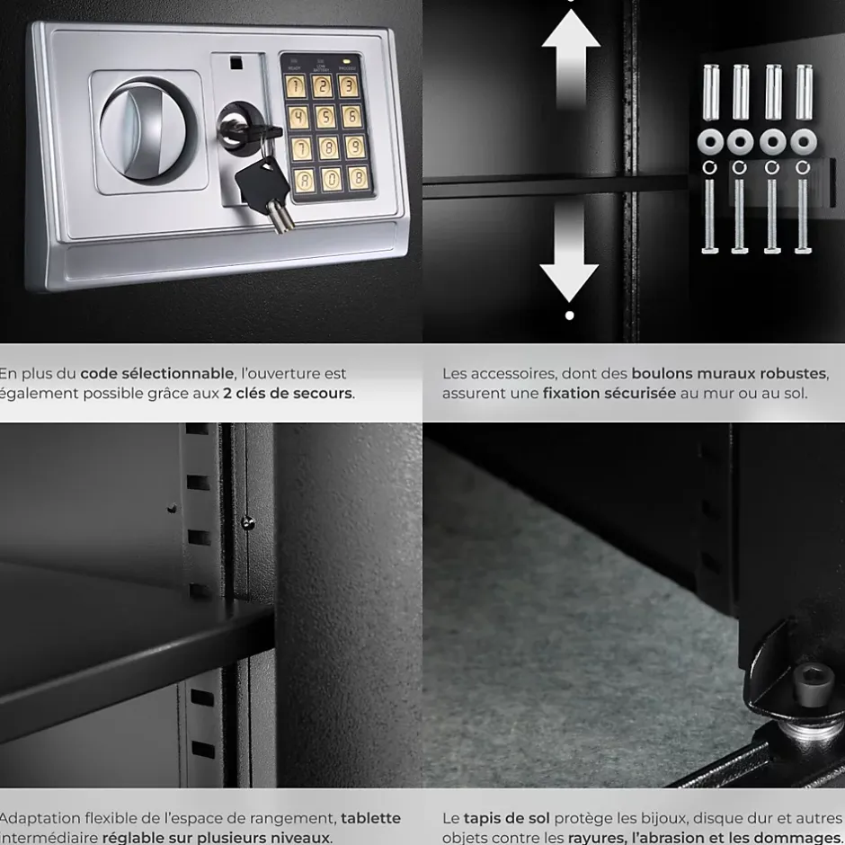 - Contenu de la livraison:1 Coffre-fort. 4 Boulons de fixation. Revêtement pour le sol. 4 Piles 1,5 Volt, Type AA. 2 Clés pour ouverture d’urgence. Mode d’emploi.