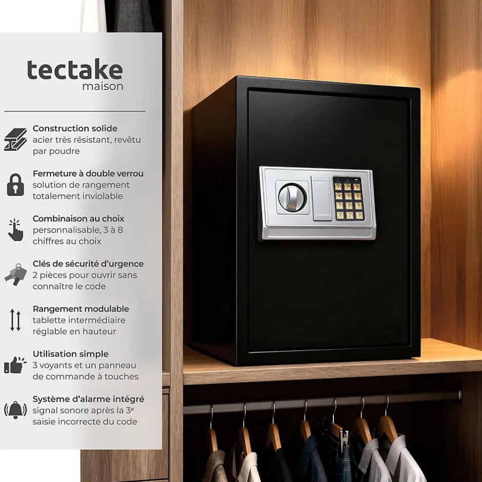 Coffre-fort en acier électronique 50 cm x 35 cm x 34,5 cm (Clés + Code digital) TECTAKE. Pour la protection de vos objets de valeur et de vos documents.Information concernant les piles incluses dans la livraison : Produit majoritairement recyclable