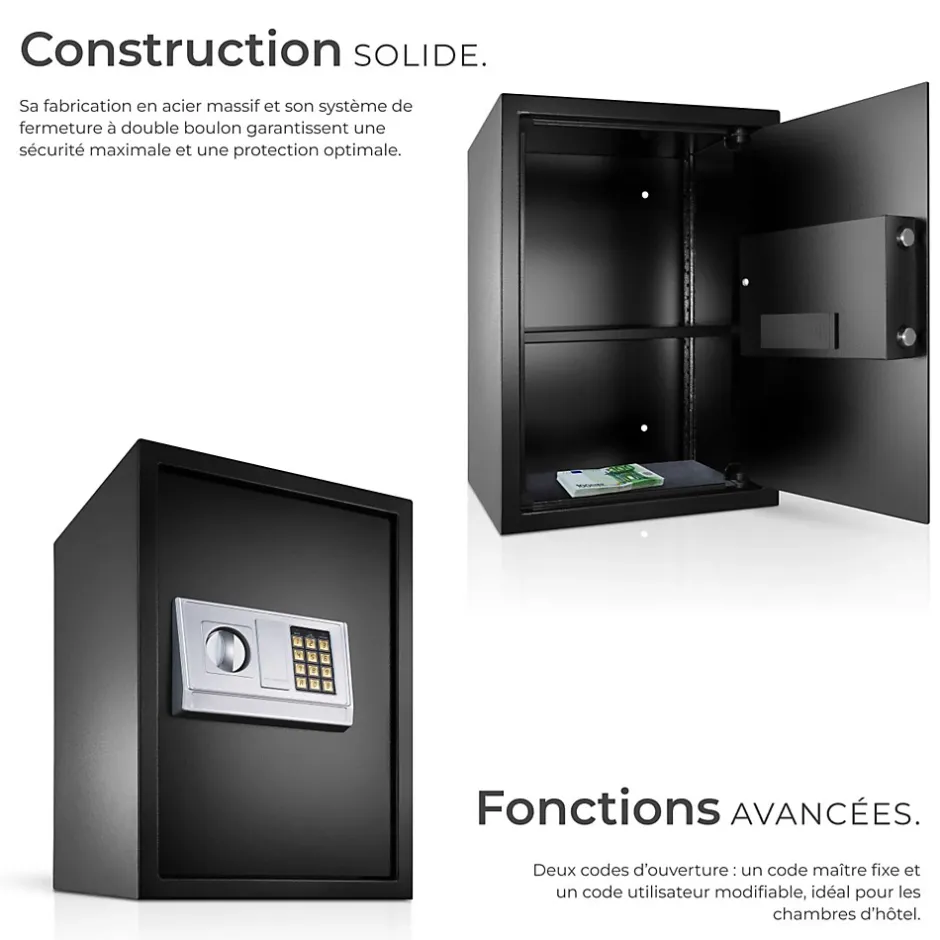 - Points Forts:Le coffre-fort peut être ouvert grâce à l’indication d’un code de sécurité programmable ou de la clé d’urgence de sécurité. Code de sécurité personnalisable (entre 3 et 8 chiffres). Porte en acier massif. La tablette intérieure peut être retirée. Fermeture de sécurité deux points. Clavier à touche souples et affichage digital LCD avec signal sonore. LED d’indication d’état (Niveau Batterie).