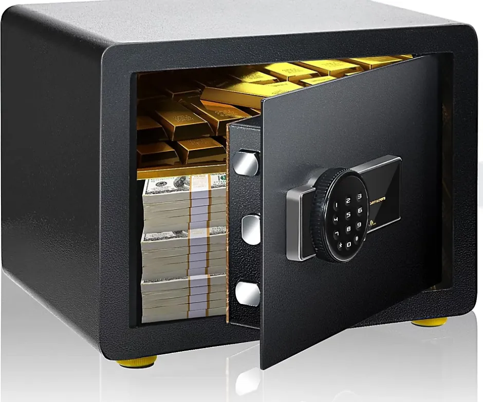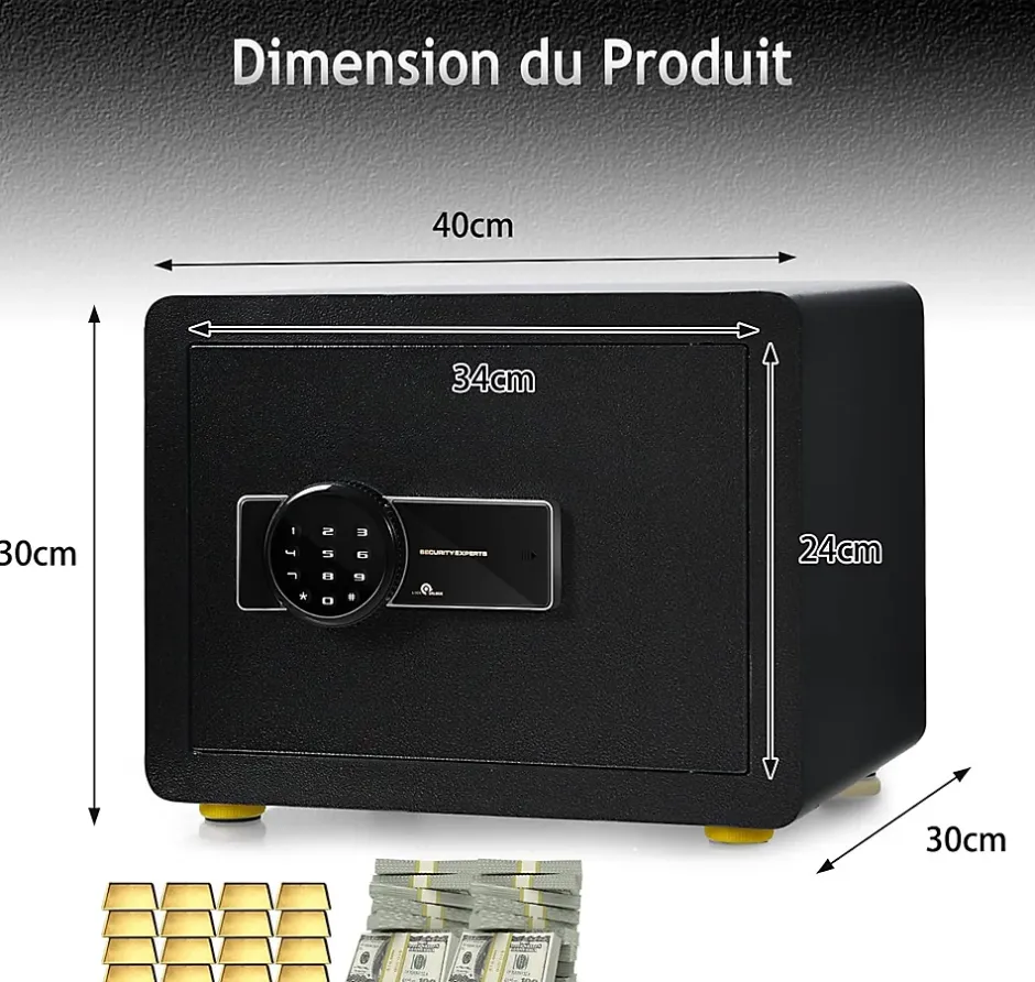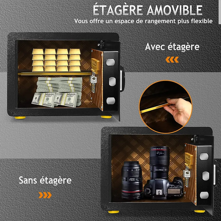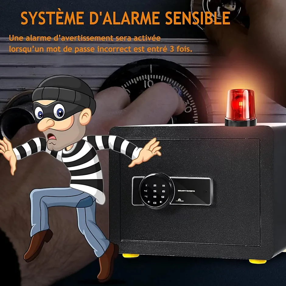 Les coffres forts électroniques sont une solution efficace pour sécuriser vos papiers, cartes bancaires ou bijoux. Le coffre-fort est en acier de construction au carbone avec 3 boulons de verrouillage de 28 mm, ce qui améliore la sécurité et la fiabilité. Vous pouvez programmer un code de 3 à 8 chiffres comme étant le vôtre ou vous pouvez utiliser les 2 clés d’urgence pour accéder à votre coffre-fort. En outre, lorsque vous entrez le mauvais mot de passe 3 fois, ce qui va déclencher l’alarme.