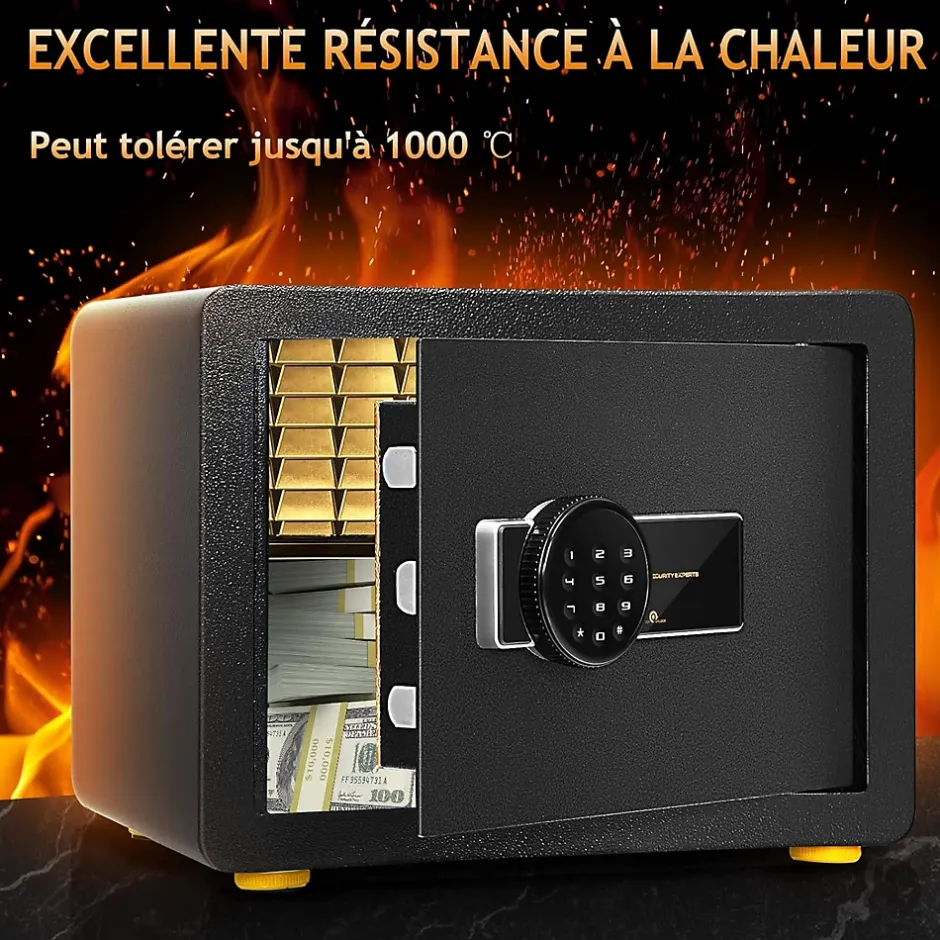 - Stockage très sécurisé : Ce coffre-fort qui est fabriqué à partir d’acier de construction au carbone robuste avec une porte en acier résistant à l’usure d’environ 5 cm d’épaisseur, peut résister à tous types d’assauts et de dégradations. De plus, le coffre-fort comporte 3 boulons de verrouillage en acier, qui ont la capacité de résister aux chocs et aux leviers.