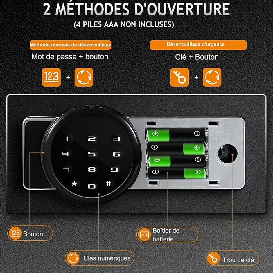 - 2 méthodes de déverrouillage : Il y a 2 méthodes d’ouverture, code numérique ou clés. Vous pouvez programmer un code de 3 à 8 chiffres comme votre propre mot de passe. En outre, le coffre-fort est livré avec deux clés d’urgence au cas où vous oublieriez votre mot de passe ou que la batterie est faible.