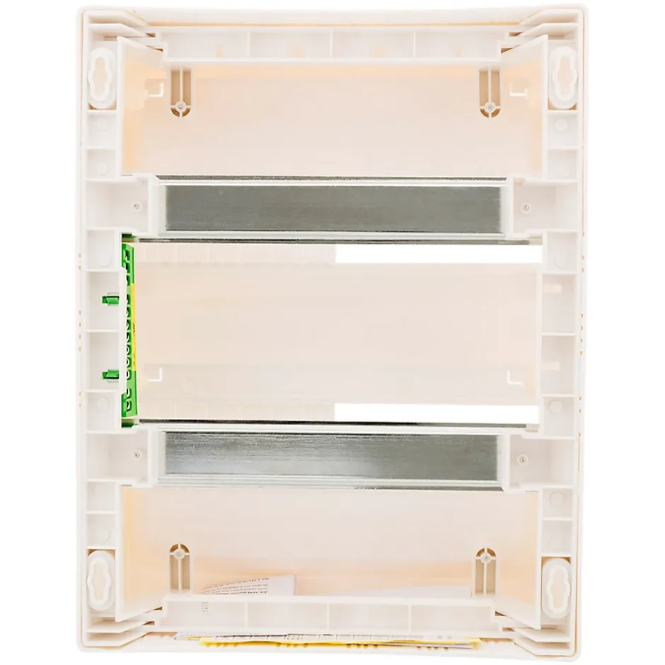 Tableau électrique à équiper. Couleur(s) : blanc. Avec 2 rangées. Nombre de modules : 26. Fixation par vis de métal. Compatible à la norme NF C 15-100