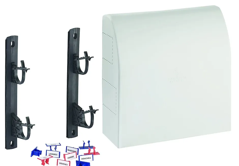 Kit support de collecteur composé d’un support, d’un cache collecteur et de clips de repérage rouge et bleu. Idéal pour repérer votre circuit d’eau.
