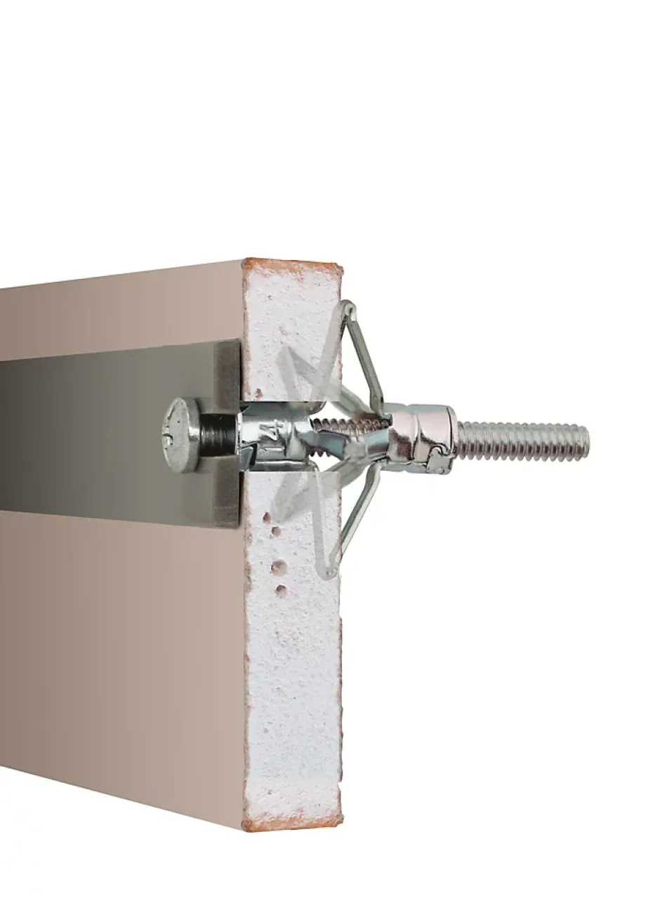 Robustes : chevilles monocorps. Traitement électrozingué. Ergonomiques : branches pré-cintrées pour une expansion aisée. Performantes : 5 branches pour une meilleure répartition de la charge. Collerette détachable : la tête se détache du corps à l’aide d’un tournevis. On peut alors pousser la cheville à l’intérieur de la cloison creuse, puis réaliser une finition esthétique