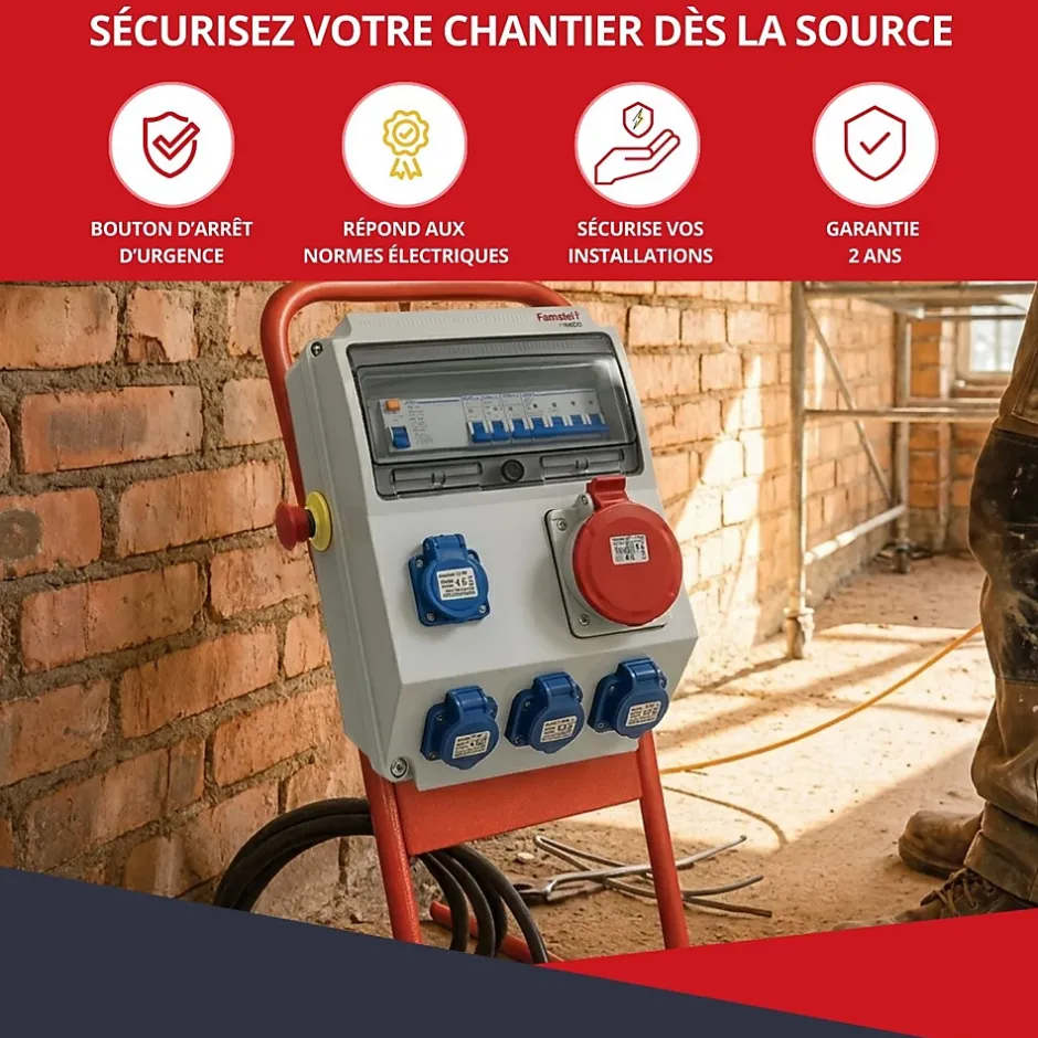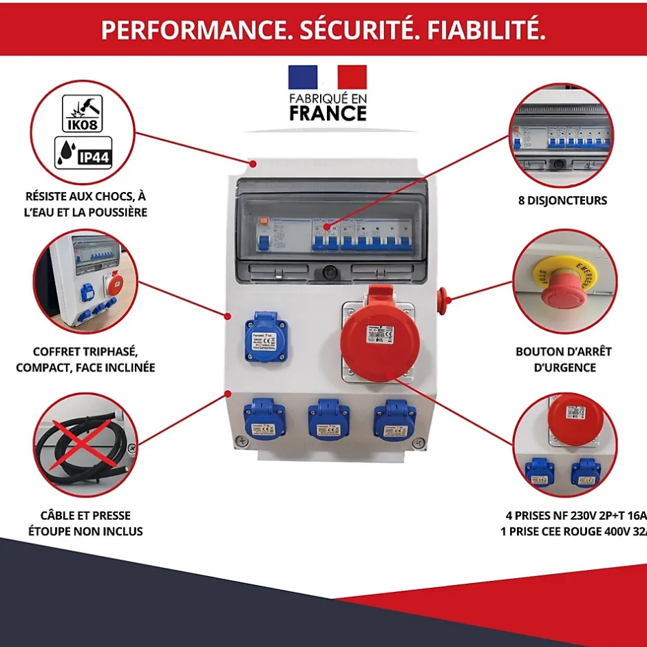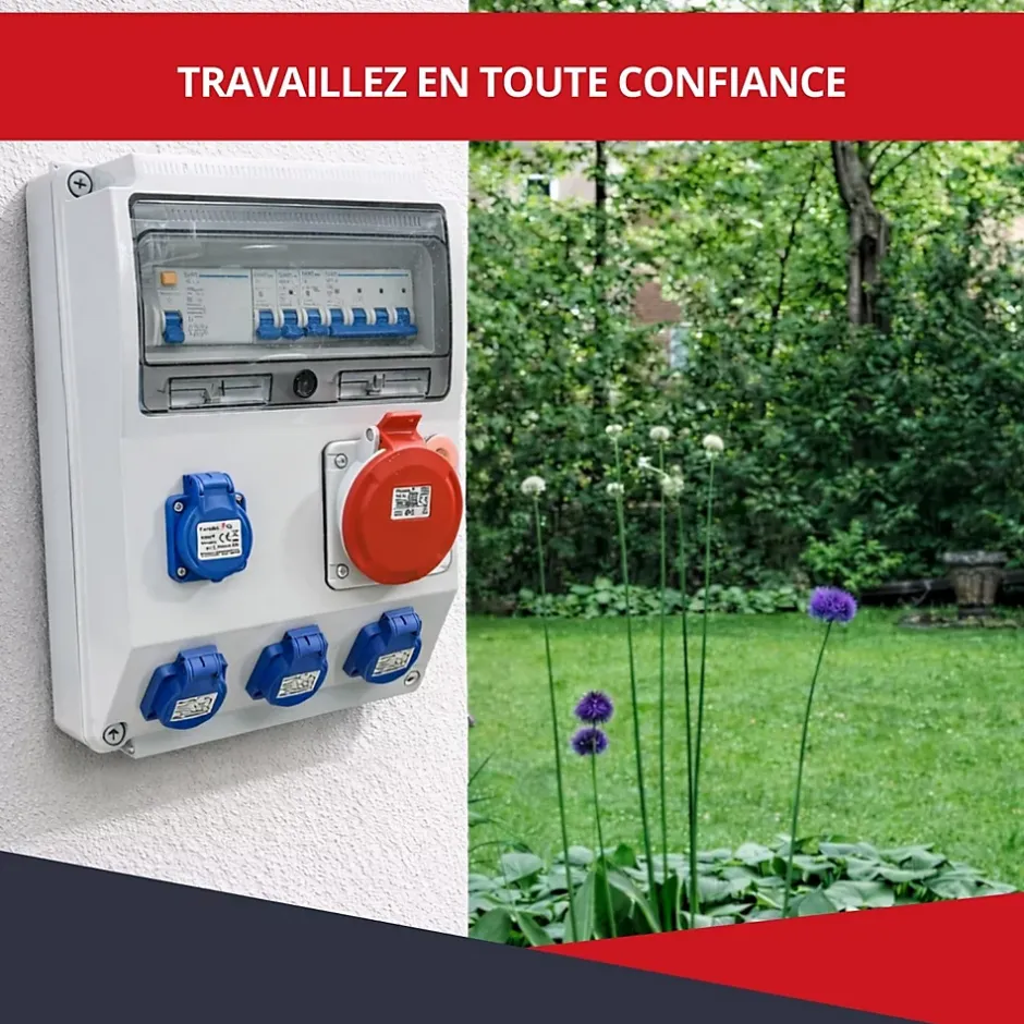Coffret de chantier monophasé IP44 idéal pour alimenter en toute sécurité les équipements sur les chantiers nécessitant une alimentation fiable et protégée. Vérifiez attentivement les informations techniques de ce coffret pour assurer la compatibilité avec vos équipements. Idéal pour les chantiers ou évènements extérieurs pour alimenter en électricité tout type d’équipement nécessitant un système triphasé. Avantages : ✅ Fabrication CE✅ Transportable✅ Résiste aux intempéries, environnements salins, UV✅ Indice de protection : IP44✅ Conforme aux normes de sécurité en vigueurCaractéristiques techniques : Triphasé Prises : 4 prises NF 2P+T – 50Hz – 32A – 440V Module : 12 Dimensions : H. 360 x L. 205 x P. 125 mm Couleur : RAL 7035 Poids : 5 kg