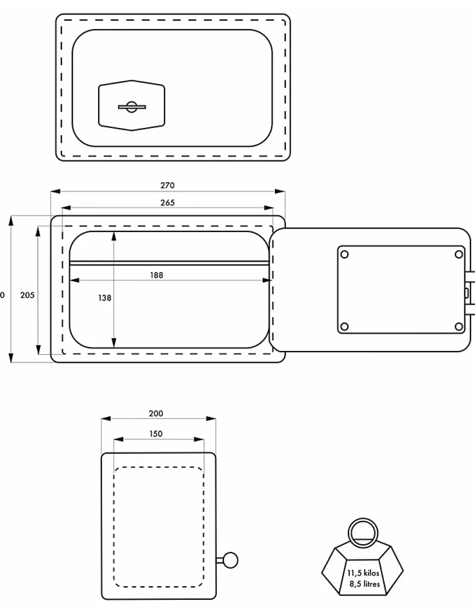 Les points clés :Contenance 8,5 litres ;Poids 11,5 kg ;Dimensions extérieures : 210 x 270 x 200mm ;Dimensions intérieures : 205 x 265 x 150mm ;Fermeture par clé (2 clés) ;Verrouillage par 2 pênes en acier chromé de Ø18 ;Garantie 5 ans.