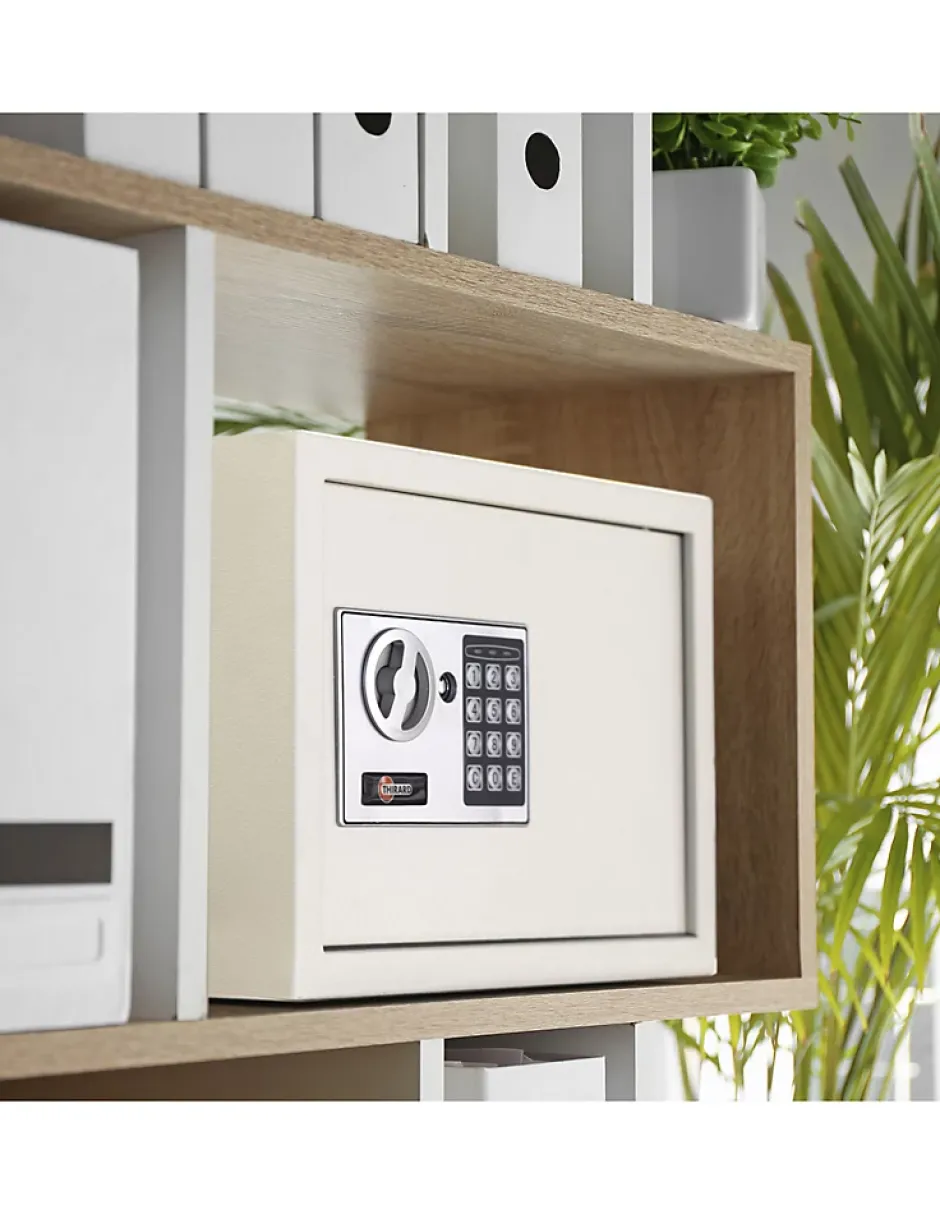 Le coffre VINCENNES protège vos documents, clés, argent et ordinateur portable grâce à une serrure électronique programmable, 2 pênes horizontaux de 16 mm et deux clés d’urgence fournies. Sa construction en acier manganèse, porte de 3 mm et corps de 1 mm, associée à la finition époxy beige, assure durabilité et résistance à la corrosion. Livré avec 4 piles LR6 et conçu pour une installation facile avec 4 trous de fixation, il offre une solution compacte et pratique pour sécuriser vos biens de valeur moyenne.