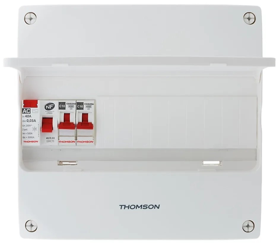 Caractéristiques du coffret électrique pré-équipé 1 rangée 13 modules – Thomson :Modèle : coffret électrique pré-équipéCouleur(s) : blancNombre de rangées : 1Nombre de modules : 13Montage facile sur Gaine Technique de Logement (GTL) ou directement sur le murCompatible GTL toutes marques3 cm d’espace libre à l’arrière du rail DIN pour un câblage accessibleOuverture/fermeture par 4 vis 1/4 de tour imperdables13 modules par rangéeTenue au fil incandescent 650°cBorniers neutre et phase 5 connexionsNorme(s) : NFC15-100Accessoires : 2 disjoncteurs : 1x 10A, 1x 16A1 interrupteur différentiel 40A type AC3 borniers (phase, neutre et terre)1 porte de protectionAide au montage : Tableaux livrés avec étiquettes et porte étiquettesPictogrammes pour identification des circuitsSchéma de câblageNotice explicative et gabarit de poseCe tableau électrique pré-équipé 1 rangée couvre l’ensemble des besoins d’une installation électrique domestique !Son design sobre et discret lui permet de s’intégrer facilement au sein de tout type d’intérieur. Il dispose d’un large espace permettant un câblage aisé. Il est idéal pour la rénovation.Le coffret électrique pré-équipé est une solution idéale pour une installation rapide et efficace dans les logements. Il offre une capacité de 13 modules sur une rangée, ce qui en fait un choix parfait pour les petits espaces.Compatible avec toutes les Goulottes Techniques de Logement (GTL), ce coffret peut être monté facilement sur GTL ou directement sur le mur, avec 3 cm d’espace libre à l’arrière du rail DIN pour un câblage simplifié. Son ouverture et sa fermeture sont facilitées par 4 vis imperdables 1/4 de tour, et il…
