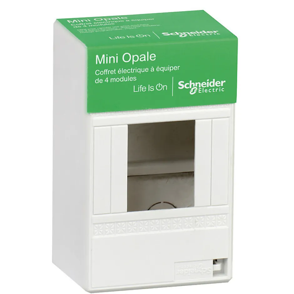 Caractéristiques du coffret mini opale 4/8 modules – Schneider :Modèle : coffret mini opaleCouleur(s) : blanc et vertNombre de modules : 4 ou 8Coffret à équiperDimensions : 4 modules : 14 x 9 x 6 cm8 modules : 16.5 x 16 x 7 cmLe coffret mini opale de Schneider 4 ou 8 modules est une solution pratique et esthétique pour vos besoins d’installation électrique !Compact, il est idéal pour les espaces restreints tout en offrant une capacité d’accueil de 4 ou 8 modules, permettant une organisation efficace de vos équipements.Ce coffret est conçu pour être équipé selon vos besoins spécifiques, offrant ainsi une flexibilité optimale pour intégrer différents dispositifs électriques.En résumé, le coffret mini opale allie fonctionnalité, esthétisme et modularité, faisant de lui un choix idéal pour les installations nécessitant une gestion efficace de l’espace.